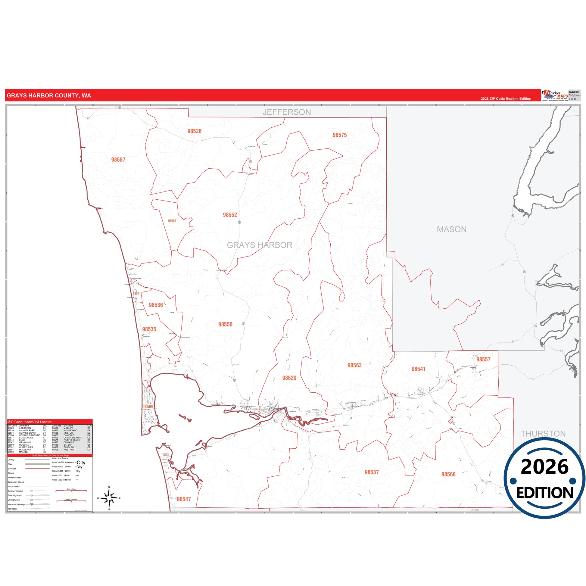 The RedLine Style map of Grays Harbor County, WA shows ZIP code areas overlaid on a detailed road network of Grays Harbor County, Washington. Ideal for drawing locations, territories, and other applications. Base map features include all major streets and highways labeled, cities and towns, county and state boundaries, neighborhood names, railroads, and a clean white background suitable for marking and planning.