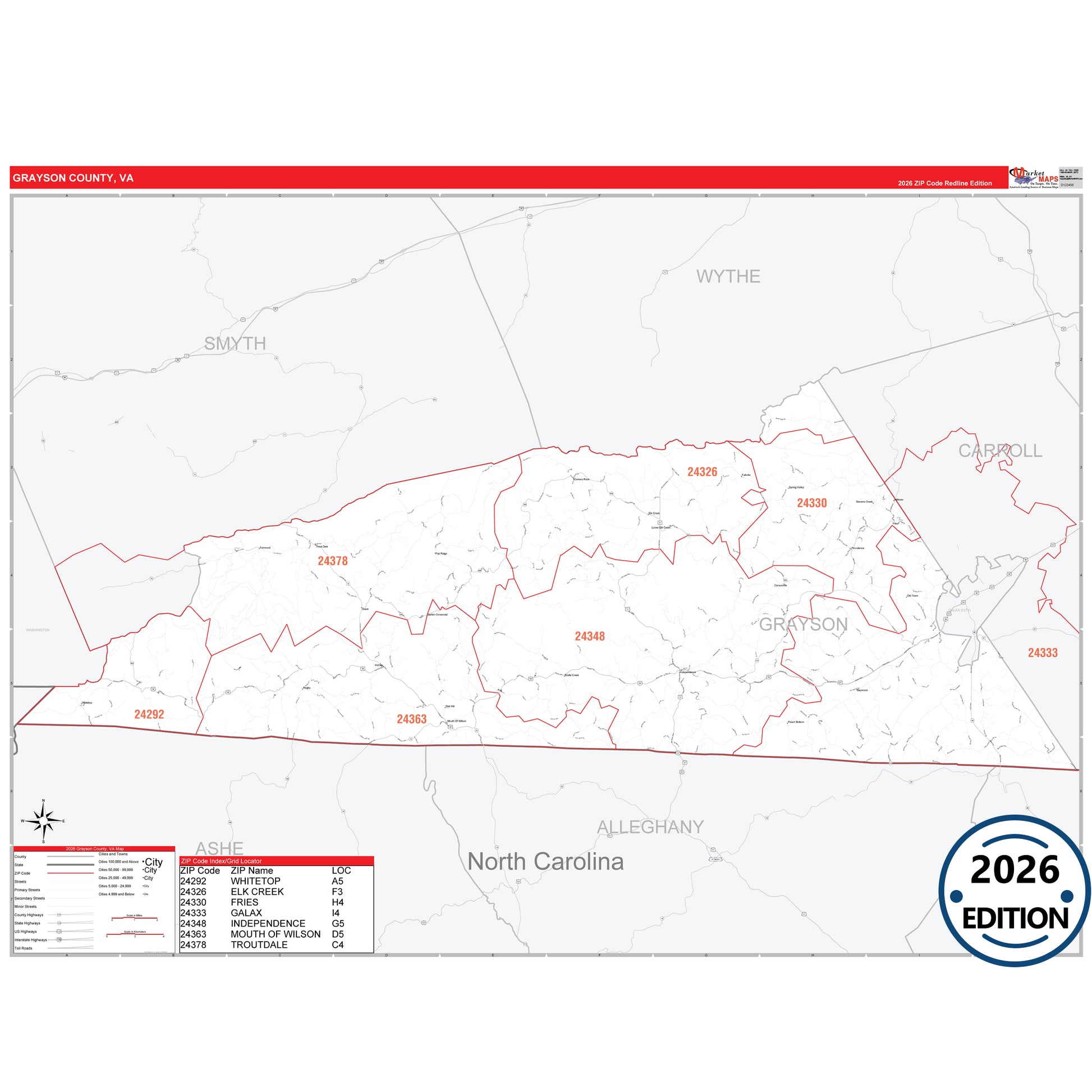 The RedLine Style map of Grayson County, VA shows ZIP code areas overlaid on a detailed road network of Grayson County, Virginia. Ideal for drawing locations, territories, and other applications. Base map features include all major streets and highways labeled, cities and towns, county and state boundaries, neighborhood names, railroads, and a clean white background suitable for marking and planning.