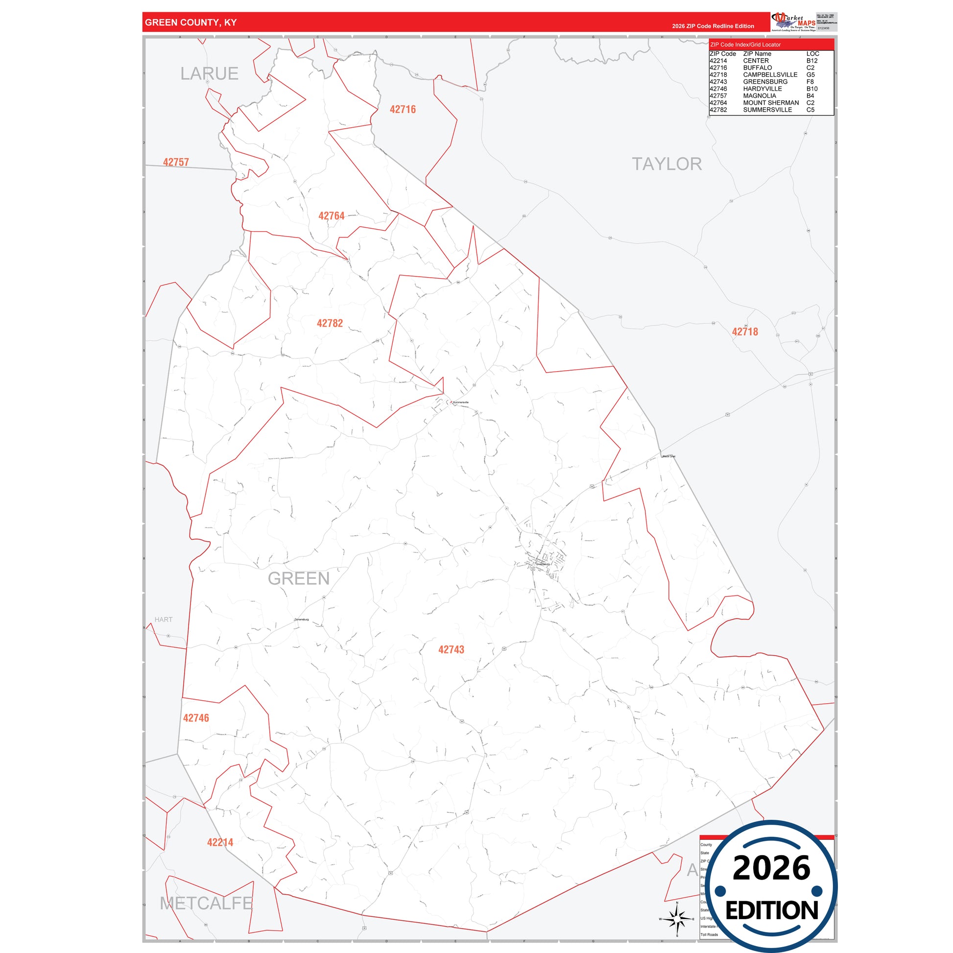The RedLine Style map of Green County, KY shows ZIP code areas overlaid on a detailed road network of Green County, Kentucky. Ideal for drawing locations, territories, and other applications. Base map features include all major streets and highways labeled, cities and towns, county and state boundaries, neighborhood names, railroads, and a clean white background suitable for marking and planning.