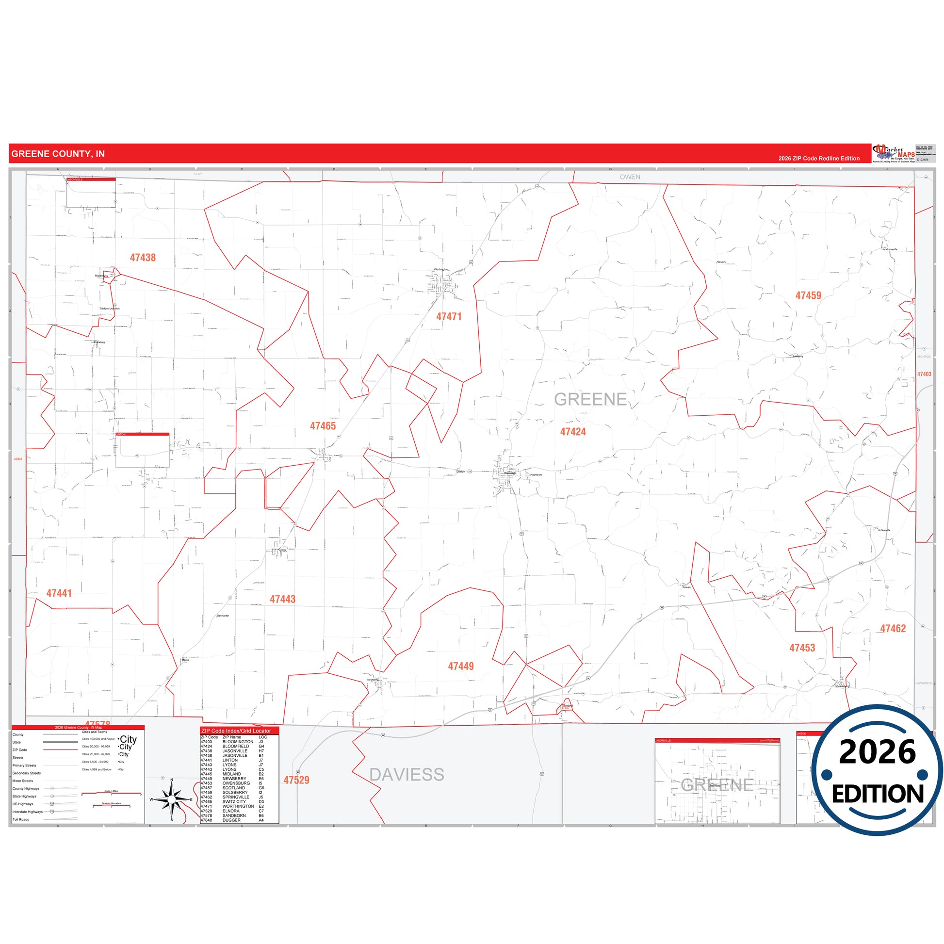 The RedLine Style map of Greene County, IN shows ZIP code areas overlaid on a detailed road network of Greene County, Indiana. Ideal for drawing locations, territories, and other applications. Base map features include all major streets and highways labeled, cities and towns, county and state boundaries, neighborhood names, railroads, and a clean white background suitable for marking and planning.
