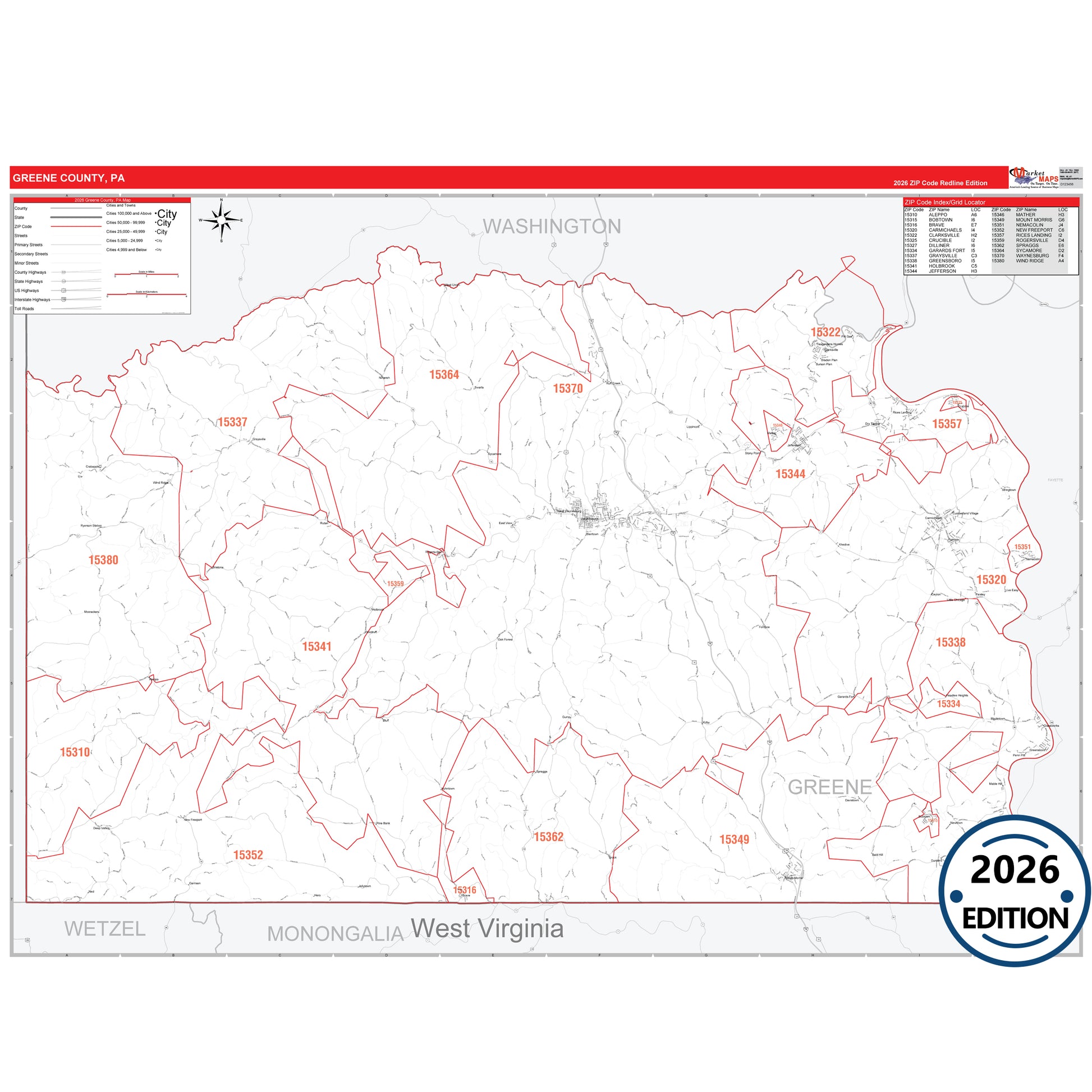 The RedLine Style map of Greene County, PA shows ZIP code areas overlaid on a detailed road network of Greene County, Pennsylvania. Ideal for drawing locations, territories, and other applications. Base map features include all major streets and highways labeled, cities and towns, county and state boundaries, neighborhood names, railroads, and a clean white background suitable for marking and planning.