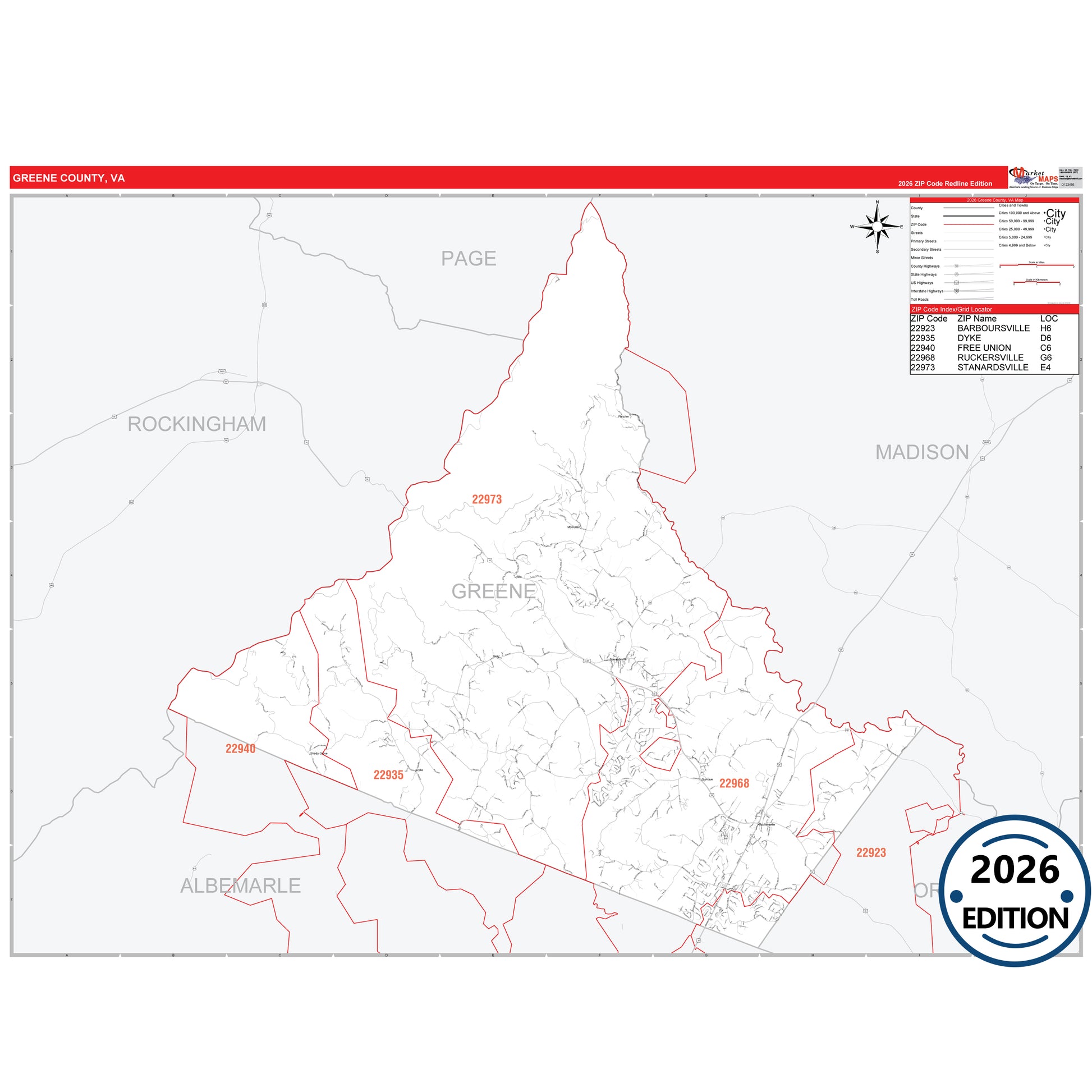 The RedLine Style map of Greene County, VA shows ZIP code areas overlaid on a detailed road network of Greene County, Virginia. Ideal for drawing locations, territories, and other applications. Base map features include all major streets and highways labeled, cities and towns, county and state boundaries, neighborhood names, railroads, and a clean white background suitable for marking and planning.