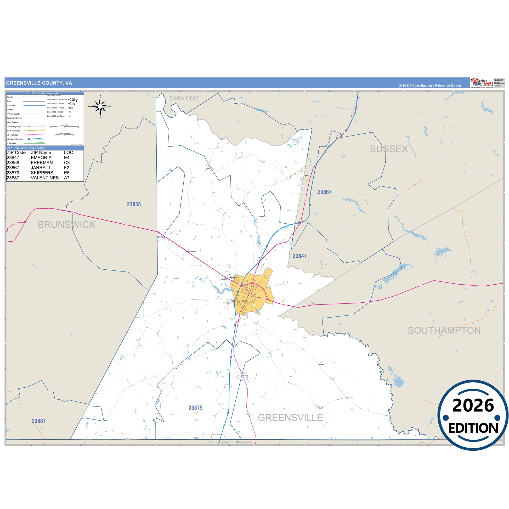The Business Reference Style Greensville County, VA is a detailed map that includes all towns, cities, major roadways, and highways. Available in multiple wall map sizes, perfect for home, school, office, or business display.