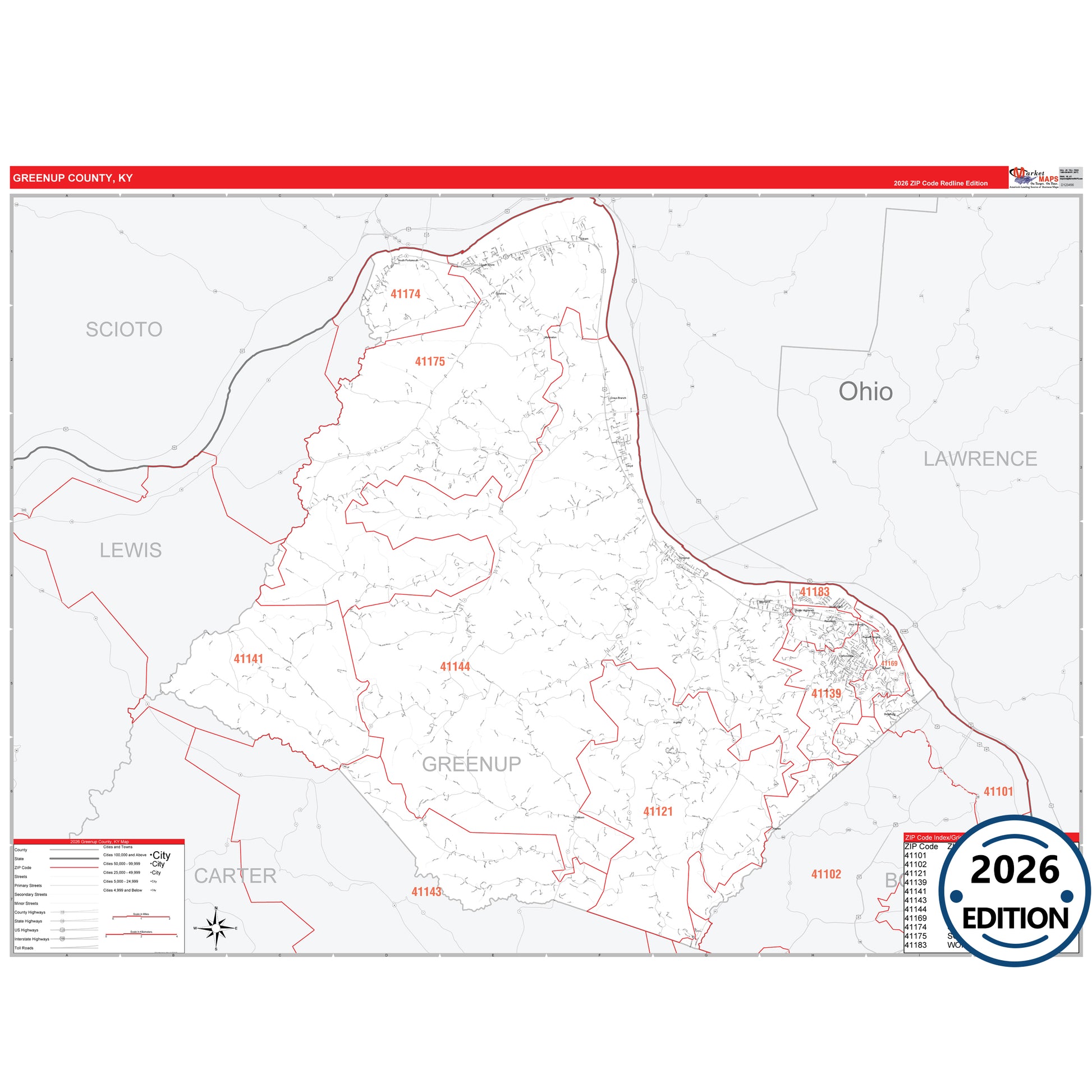 The RedLine Style map of Greenup County, KY shows ZIP code areas overlaid on a detailed road network of Greenup County, Kentucky. Ideal for drawing locations, territories, and other applications. Base map features include all major streets and highways labeled, cities and towns, county and state boundaries, neighborhood names, railroads, and a clean white background suitable for marking and planning.