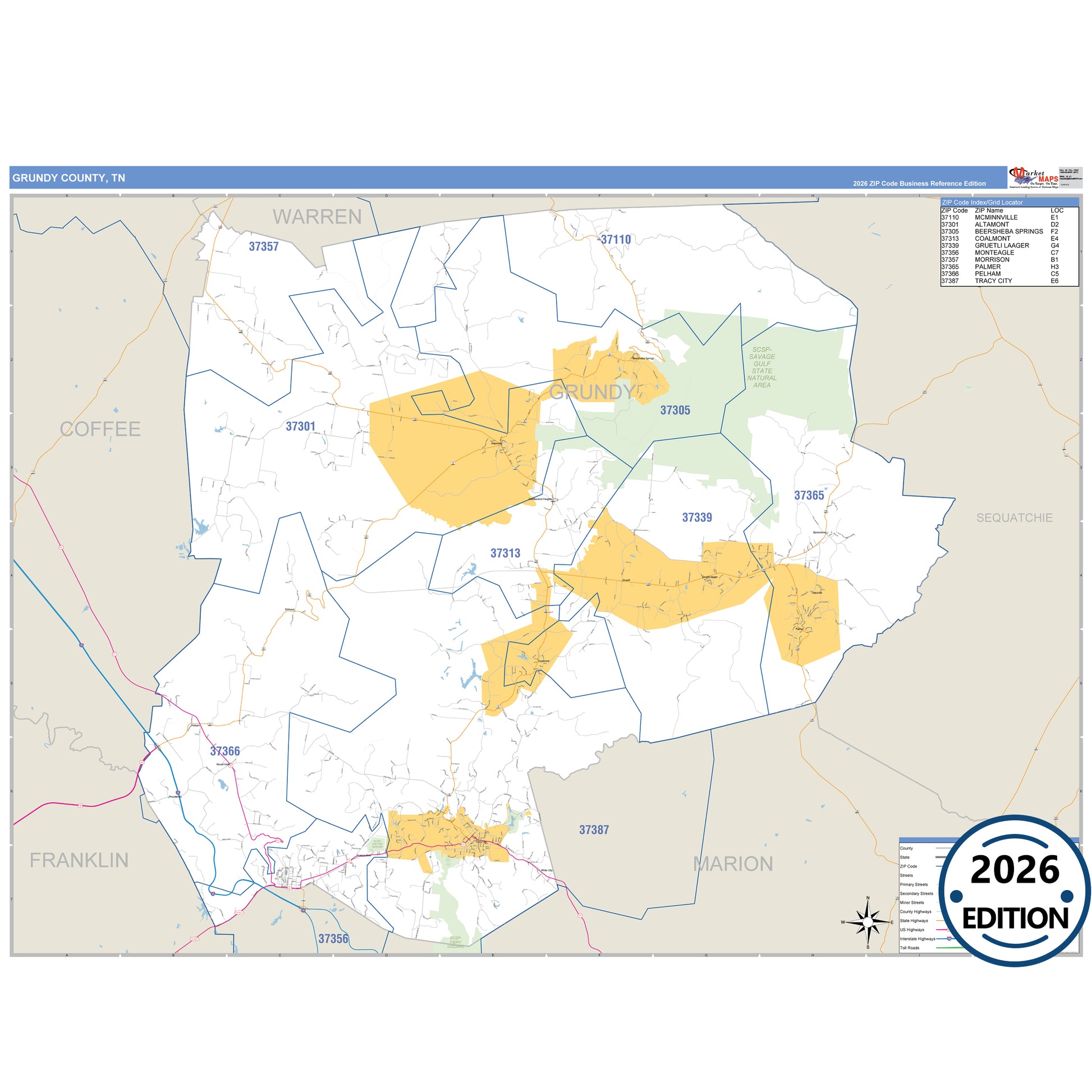 The Business Reference Style Grundy County, TN is a detailed map that includes all towns, cities, major roadways, and highways. Available in multiple wall map sizes, perfect for home, school, office, or business display.