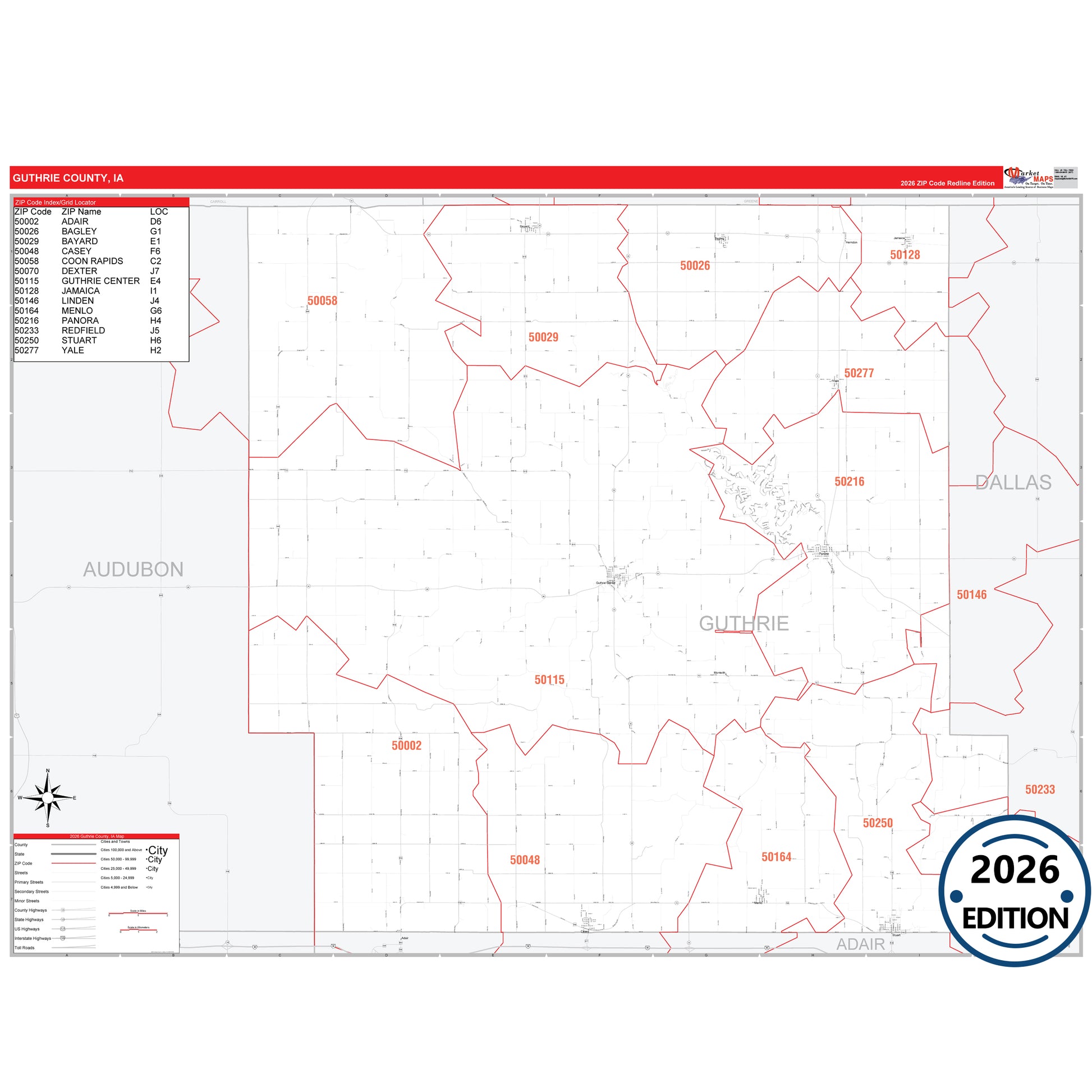 The RedLine Style map of Guthrie County, IA shows ZIP code areas overlaid on a detailed road network of Guthrie County, Iowa. Ideal for drawing locations, territories, and other applications. Base map features include all major streets and highways labeled, cities and towns, county and state boundaries, neighborhood names, railroads, and a clean white background suitable for marking and planning.