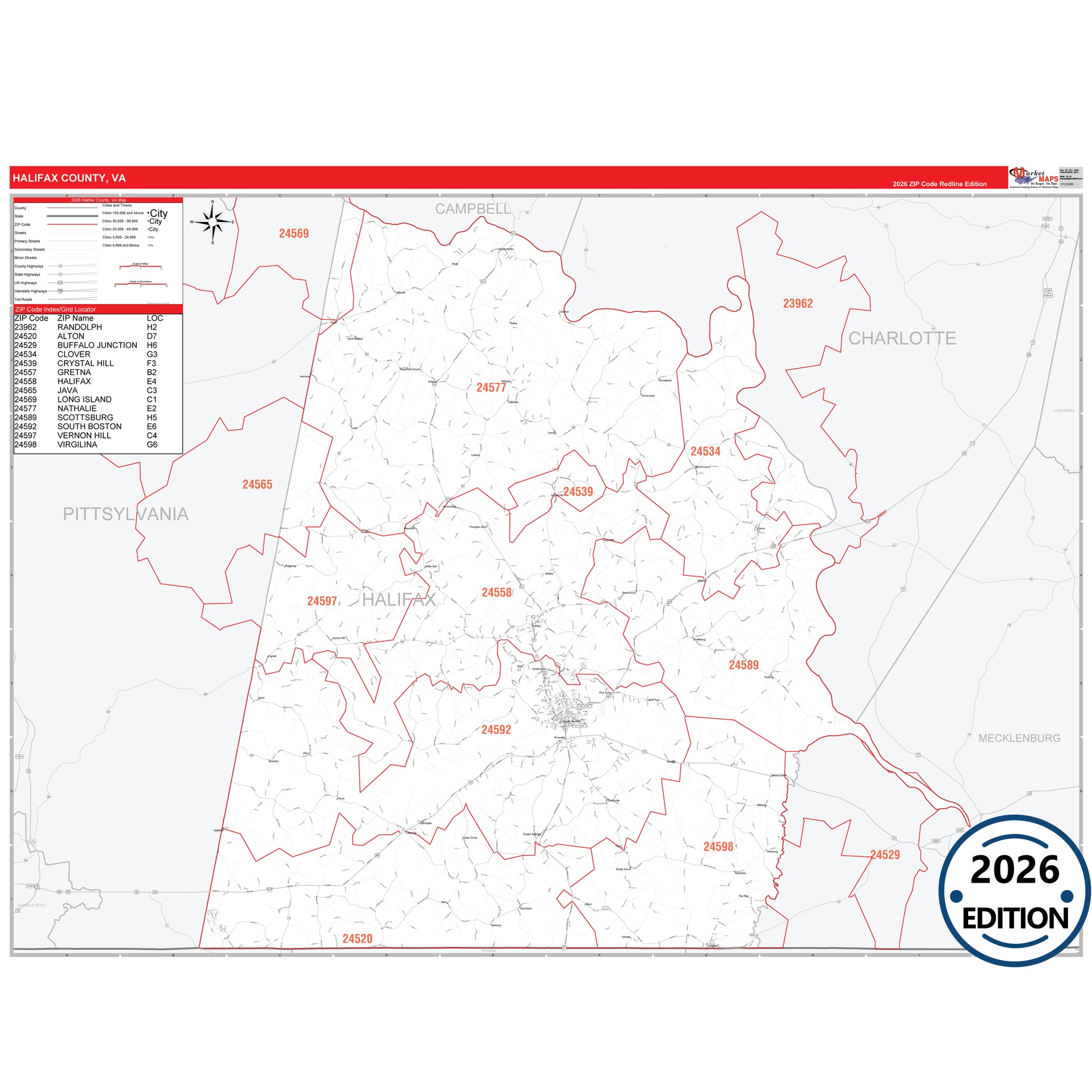 The RedLine Style map of Halifax County, VA shows ZIP code areas overlaid on a detailed road network of Halifax County, Virginia. Ideal for drawing locations, territories, and other applications. Base map features include all major streets and highways labeled, cities and towns, county and state boundaries, neighborhood names, railroads, and a clean white background suitable for marking and planning.