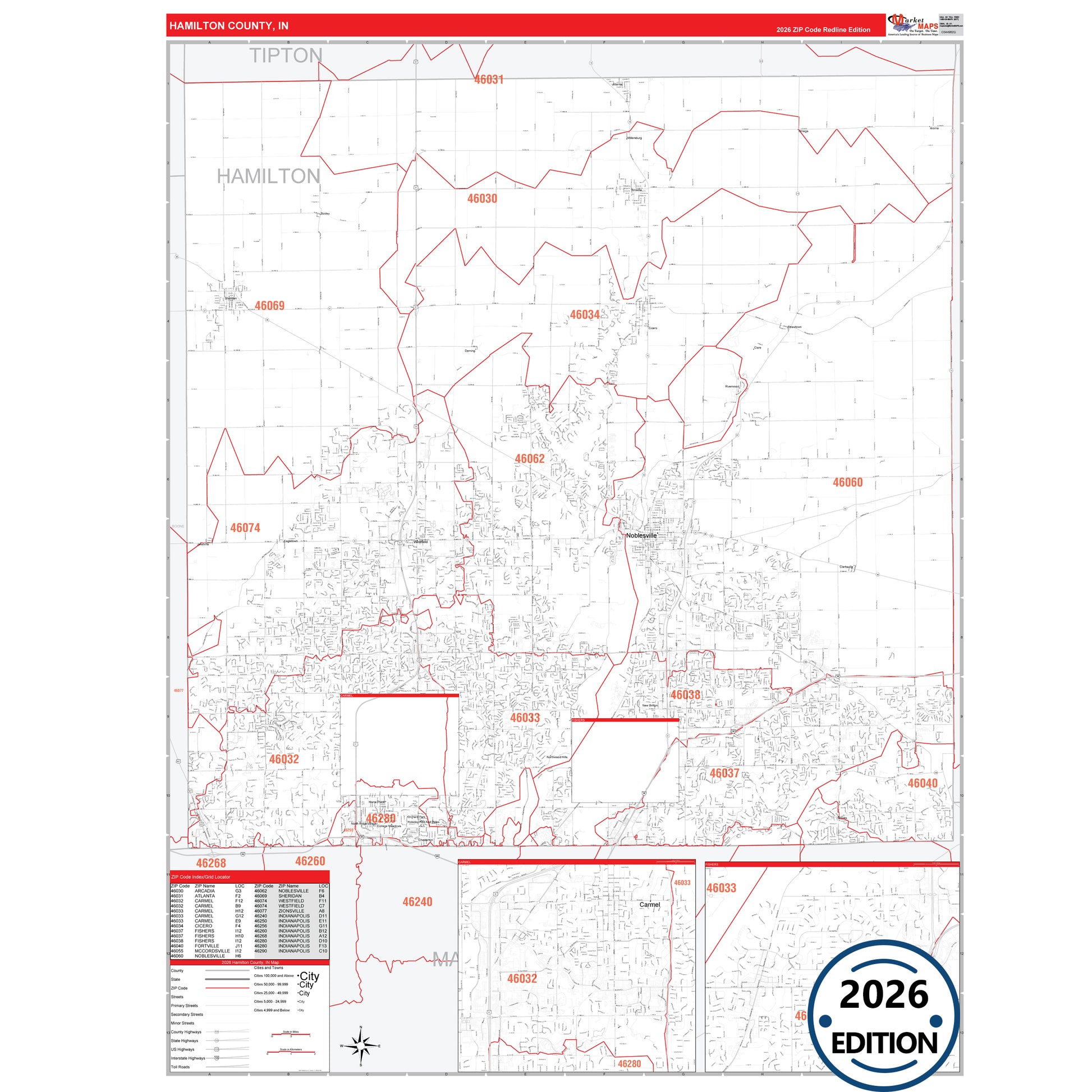 The RedLine Style map of Hamilton County, IN shows ZIP code areas overlaid on a detailed road network of Hamilton County, Indiana. Ideal for drawing locations, territories, and other applications. Base map features include all major streets and highways labeled, cities and towns, county and state boundaries, neighborhood names, railroads, and a clean white background suitable for marking and planning.