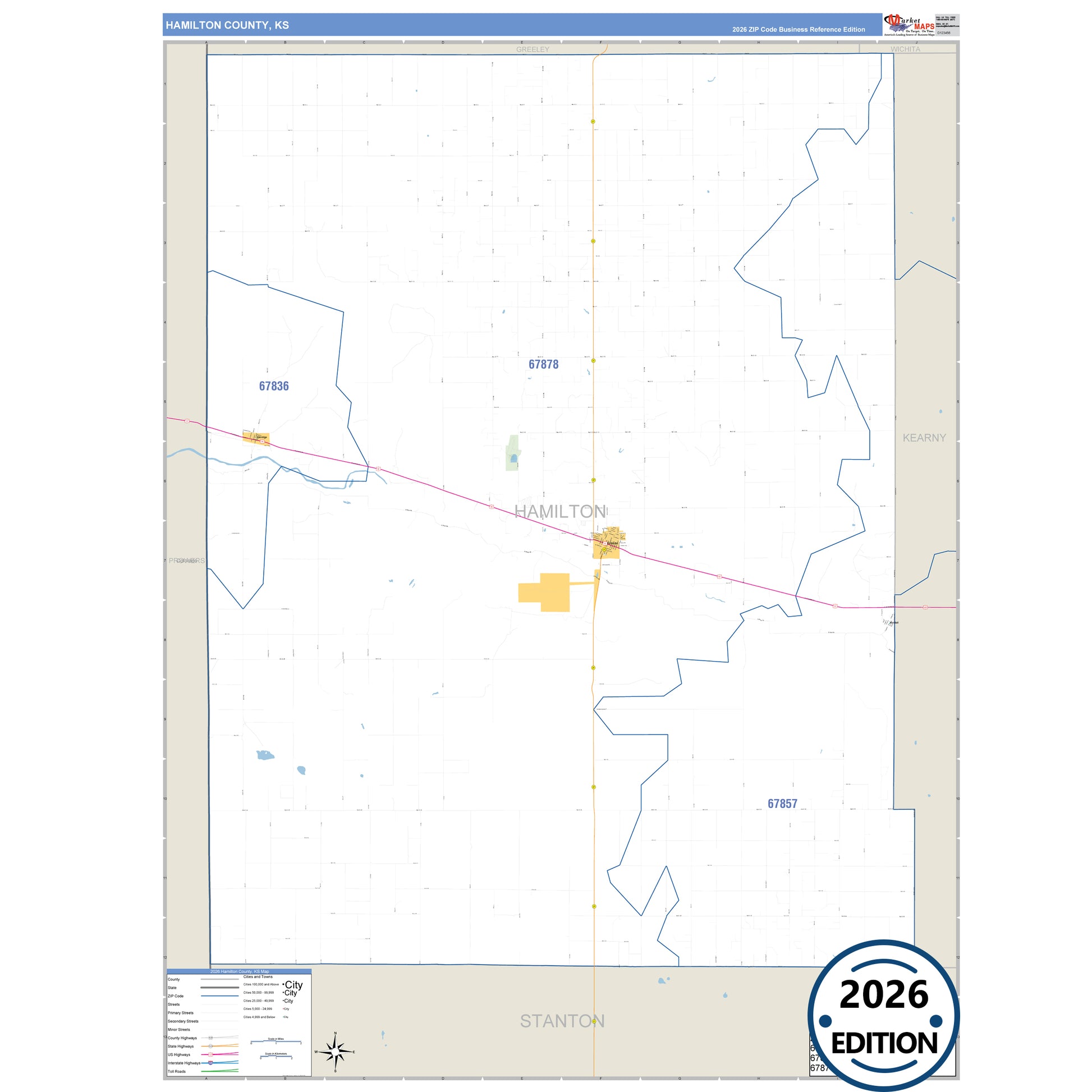 The Business Reference Style Hamilton County, KS is a detailed map that includes all towns, cities, major roadways, and highways. Available in multiple wall map sizes, perfect for home, school, office, or business display.