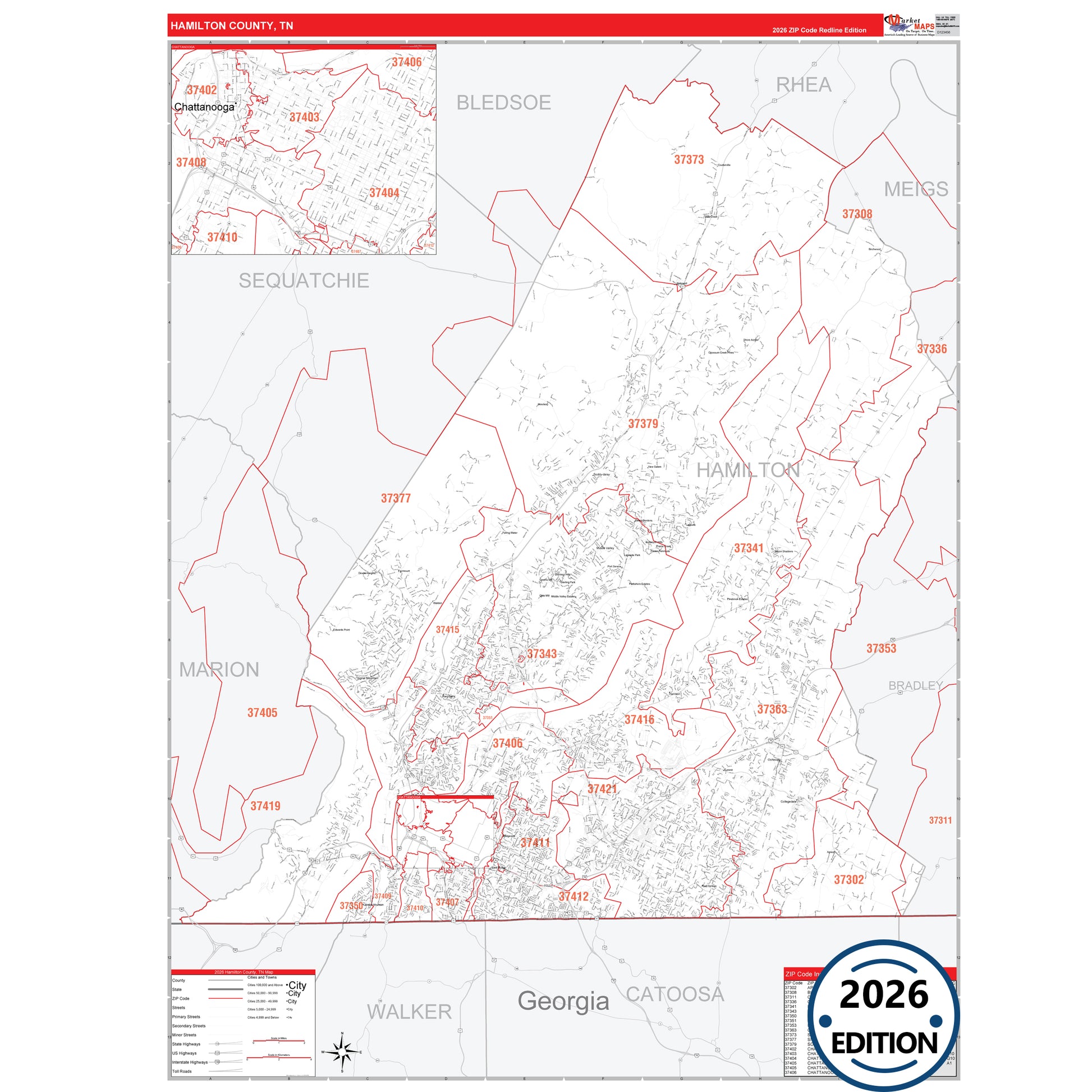 The RedLine Style map of Hamilton County, TN shows ZIP code areas overlaid on a detailed road network of Hamilton County, Tennessee. Ideal for drawing locations, territories, and other applications. Base map features include all major streets and highways labeled, cities and towns, county and state boundaries, neighborhood names, railroads, and a clean white background suitable for marking and planning.