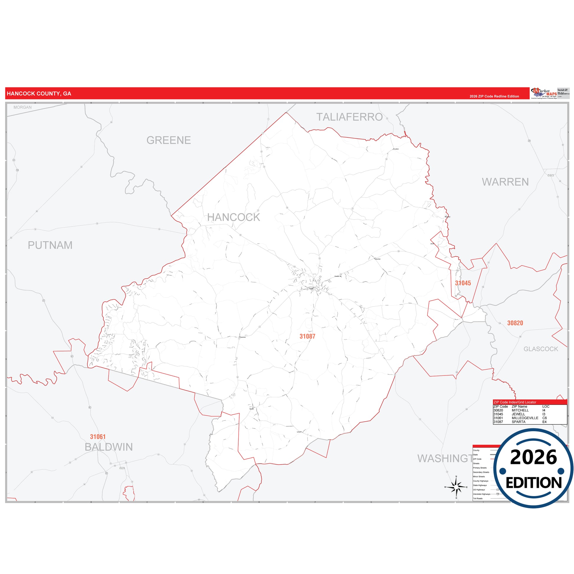 The RedLine Style map of Hancock County, GA shows ZIP code areas overlaid on a detailed road network of Hancock County, Georgia. Ideal for drawing locations, territories, and other applications. Base map features include all major streets and highways labeled, cities and towns, county and state boundaries, neighborhood names, railroads, and a clean white background suitable for marking and planning.