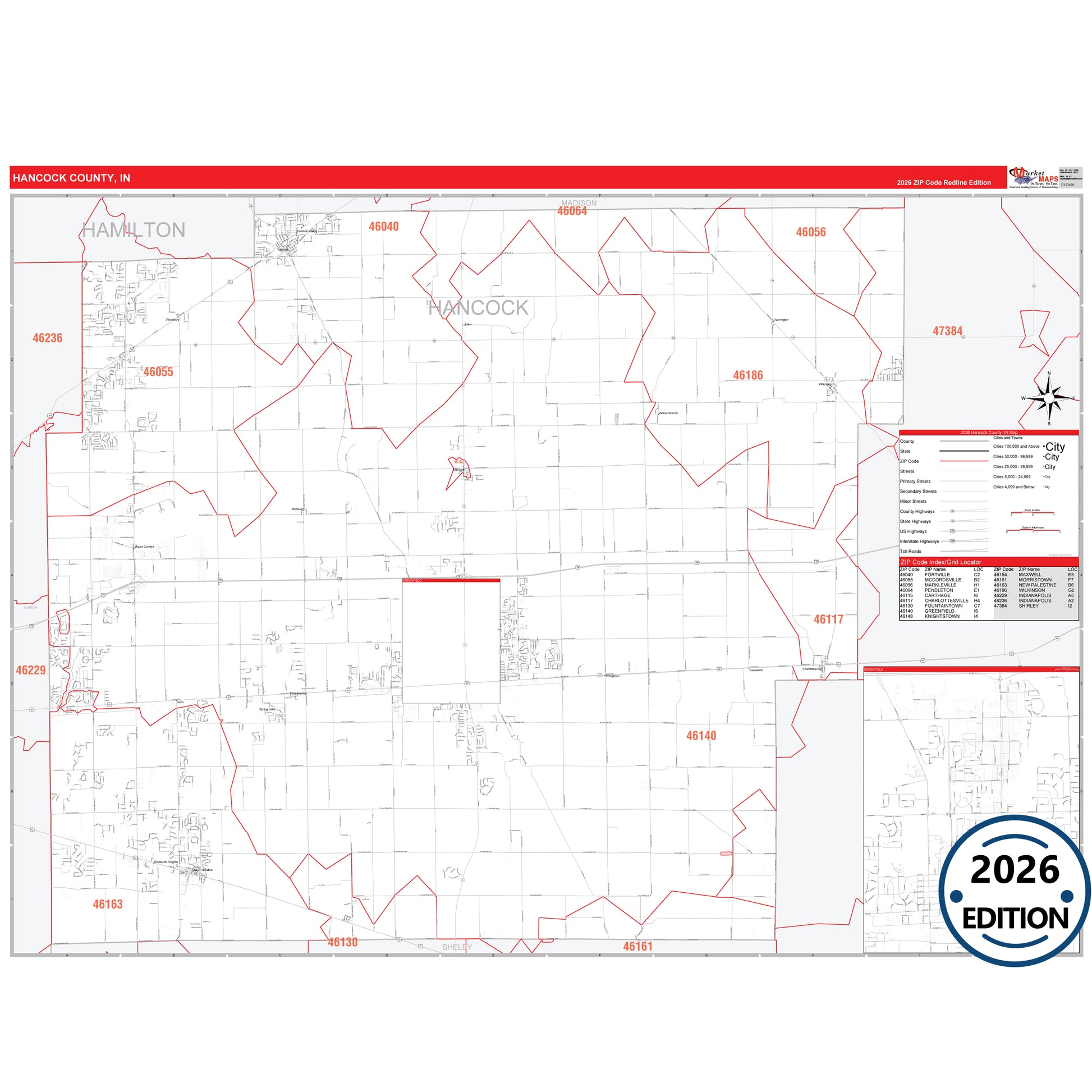 The RedLine Style map of Hancock County, IN shows ZIP code areas overlaid on a detailed road network of Hancock County, Indiana. Ideal for drawing locations, territories, and other applications. Base map features include all major streets and highways labeled, cities and towns, county and state boundaries, neighborhood names, railroads, and a clean white background suitable for marking and planning.