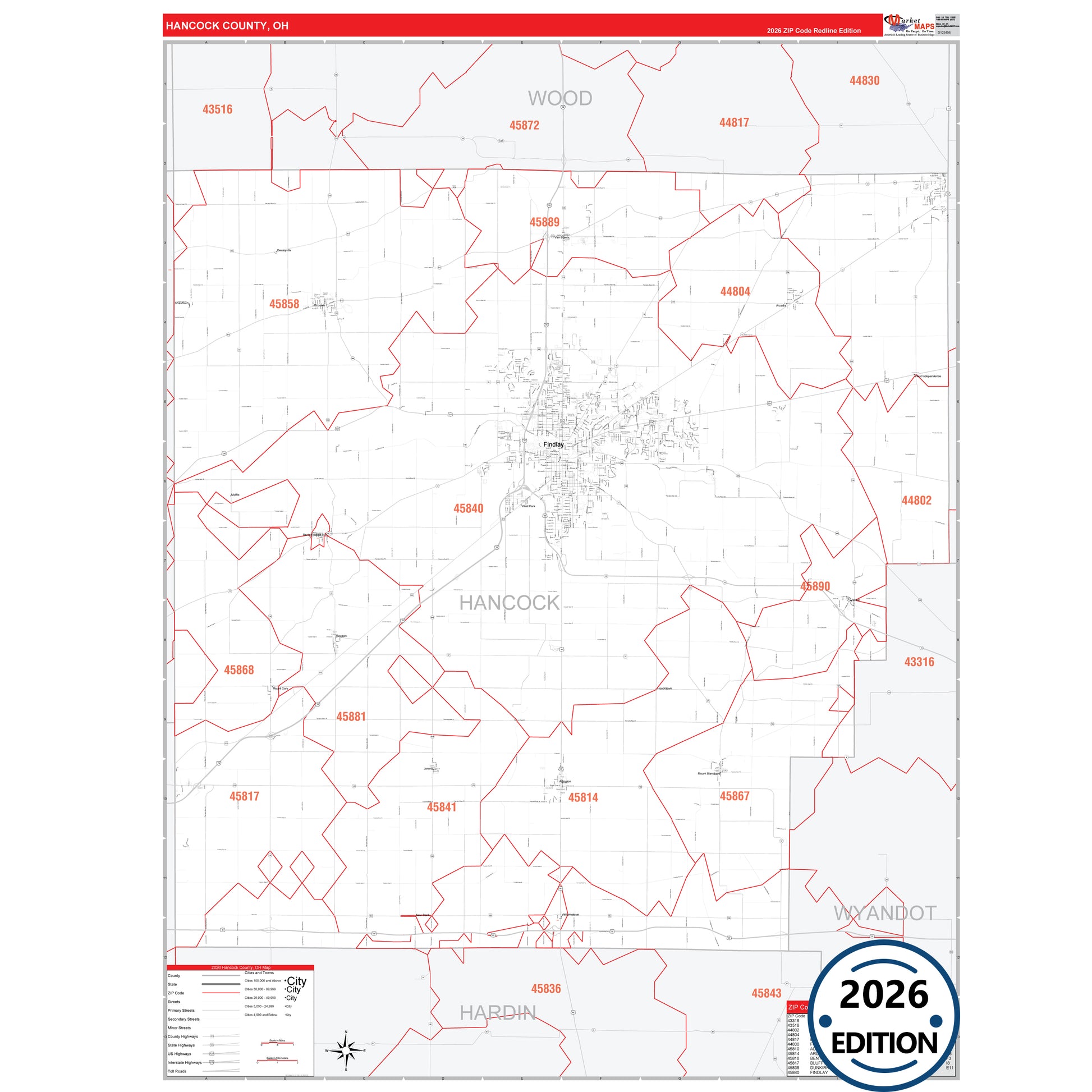 The RedLine Style map of Hancock County, OH shows ZIP code areas overlaid on a detailed road network of Hancock County, Ohio. Ideal for drawing locations, territories, and other applications. Base map features include all major streets and highways labeled, cities and towns, county and state boundaries, neighborhood names, railroads, and a clean white background suitable for marking and planning.