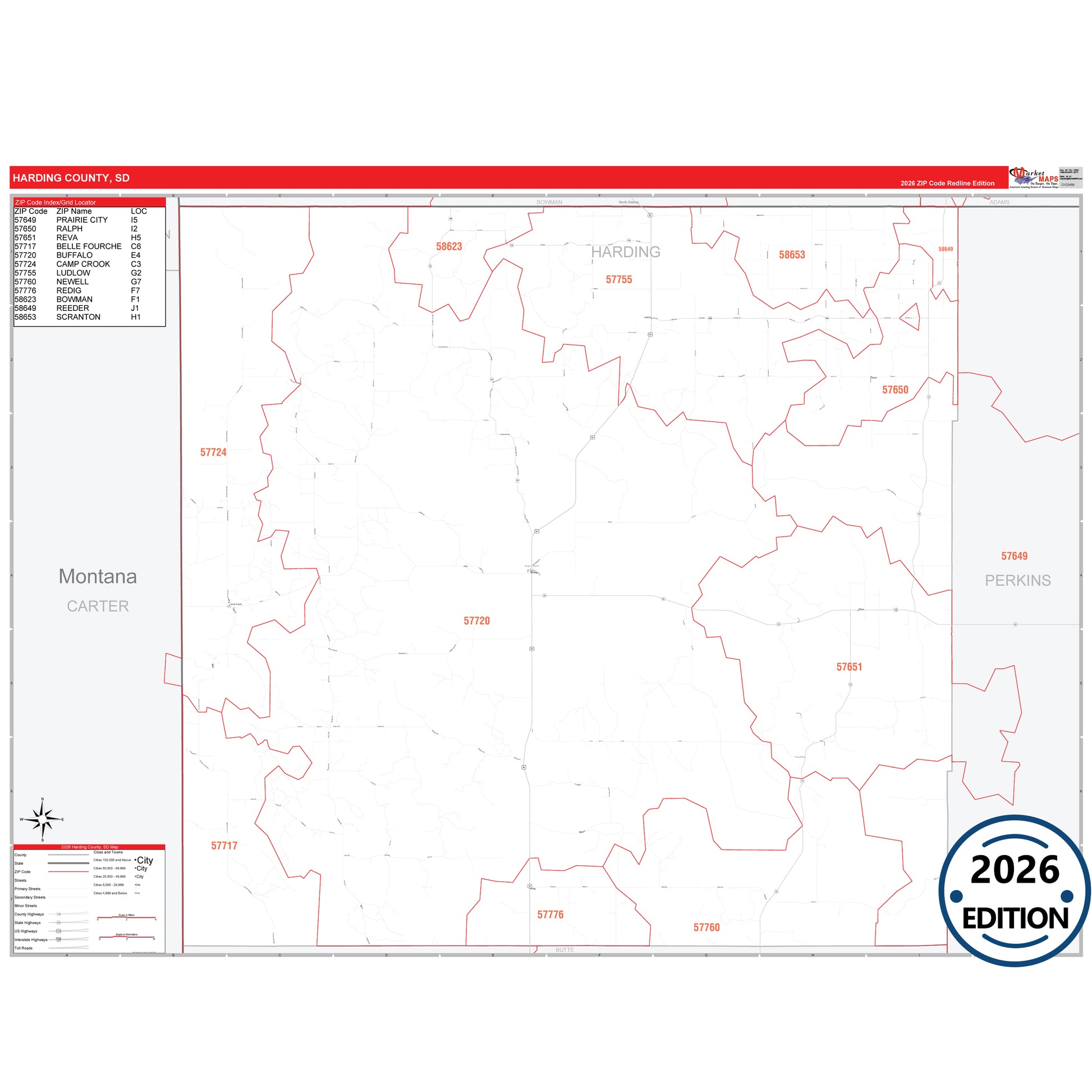 The RedLine Style map of Harding County, SD shows ZIP code areas overlaid on a detailed road network of Harding County, South Dakota. Ideal for drawing locations, territories, and other applications. Base map features include all major streets and highways labeled, cities and towns, county and state boundaries, neighborhood names, railroads, and a clean white background suitable for marking and planning.