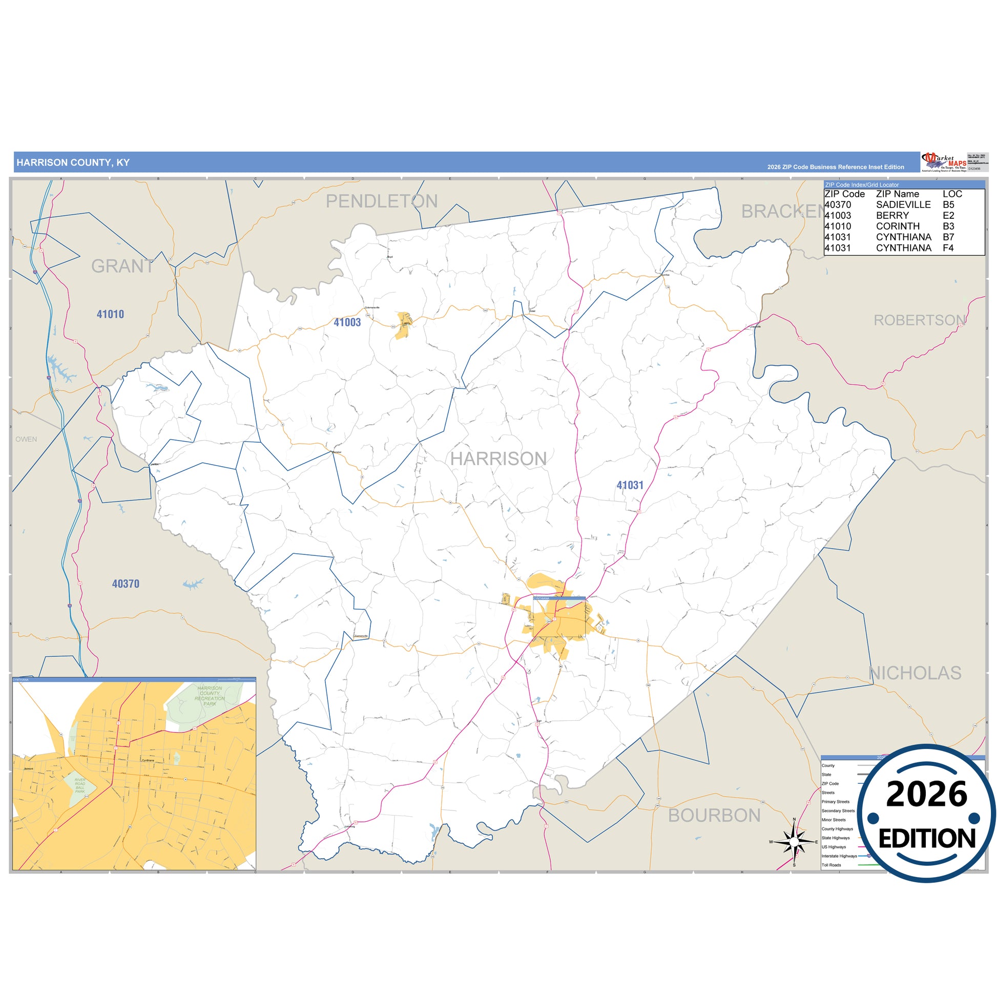 The Business Reference Style Harrison County, KY is a detailed map that includes all towns, cities, major roadways, and highways. Available in multiple wall map sizes, perfect for home, school, office, or business display.