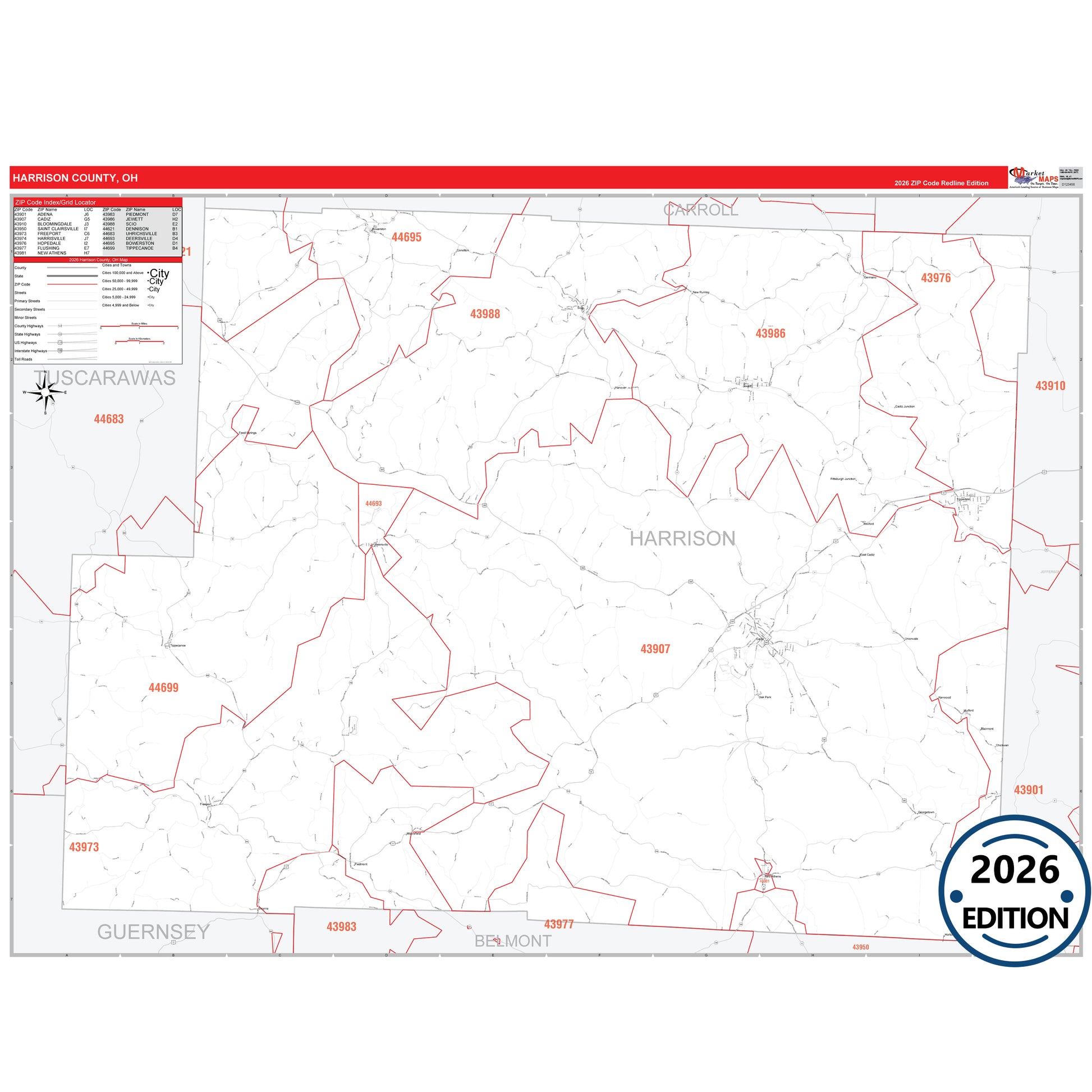 The RedLine Style map of Harrison County, OH shows ZIP code areas overlaid on a detailed road network of Harrison County, Ohio. Ideal for drawing locations, territories, and other applications. Base map features include all major streets and highways labeled, cities and towns, county and state boundaries, neighborhood names, railroads, and a clean white background suitable for marking and planning.