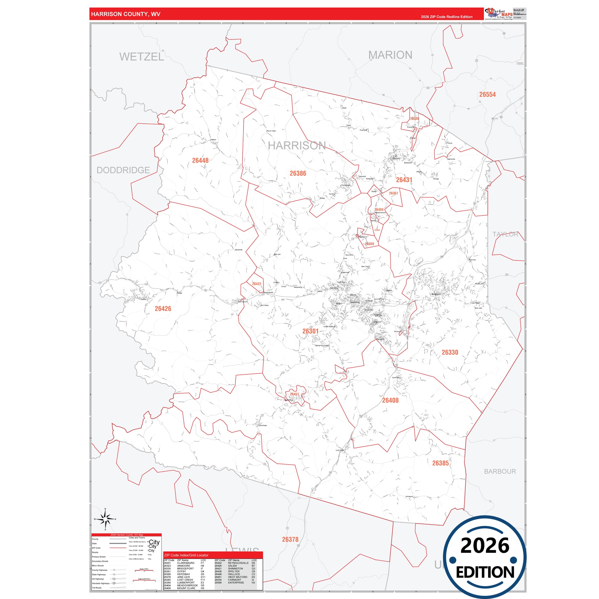 The RedLine Style map of Harrison County, WV shows ZIP code areas overlaid on a detailed road network of Harrison County, West Virginia. Ideal for drawing locations, territories, and other applications. Base map features include all major streets and highways labeled, cities and towns, county and state boundaries, neighborhood names, railroads, and a clean white background suitable for marking and planning.