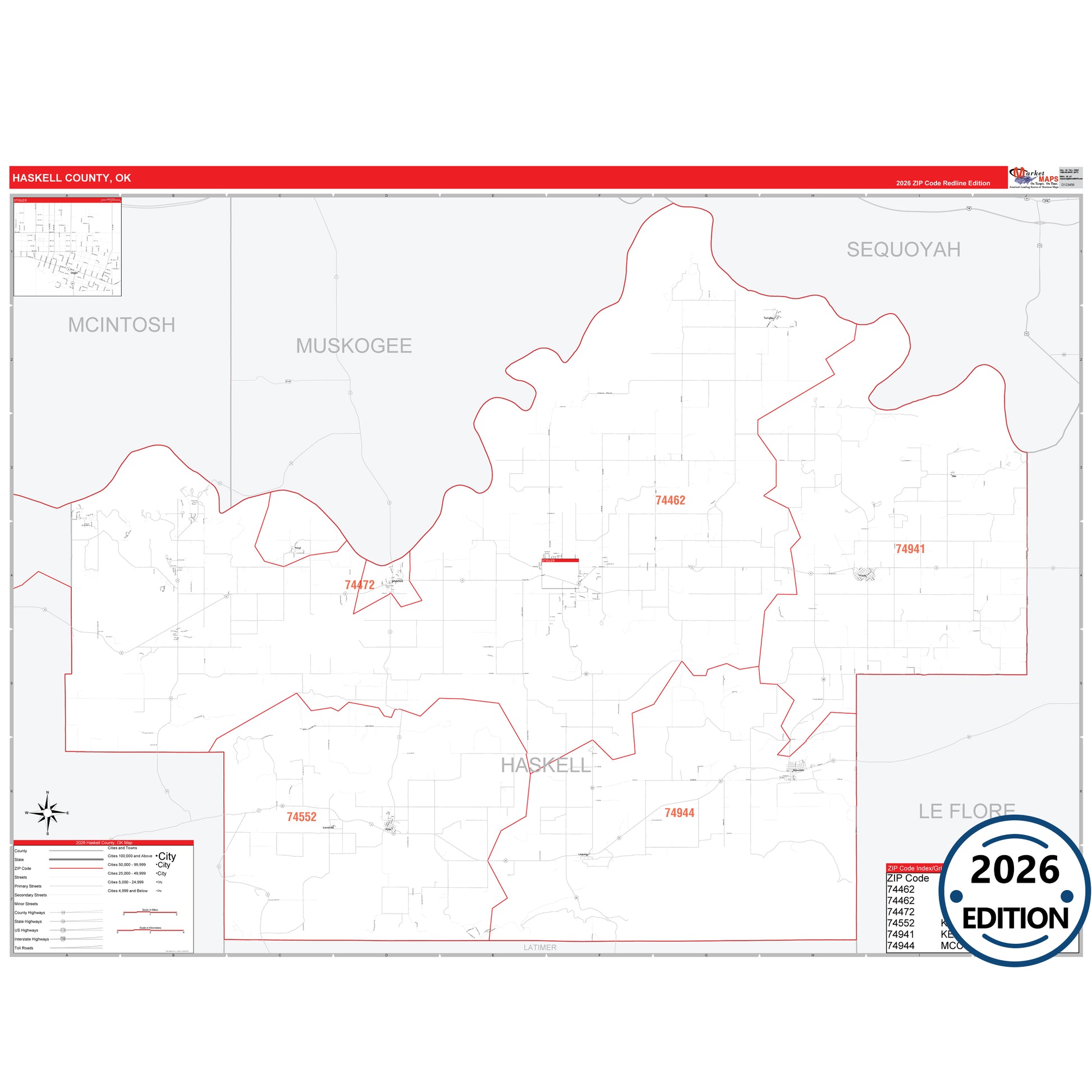The RedLine Style map of Haskell County, OK shows ZIP code areas overlaid on a detailed road network of Haskell County, Oklahoma. Ideal for drawing locations, territories, and other applications. Base map features include all major streets and highways labeled, cities and towns, county and state boundaries, neighborhood names, railroads, and a clean white background suitable for marking and planning.