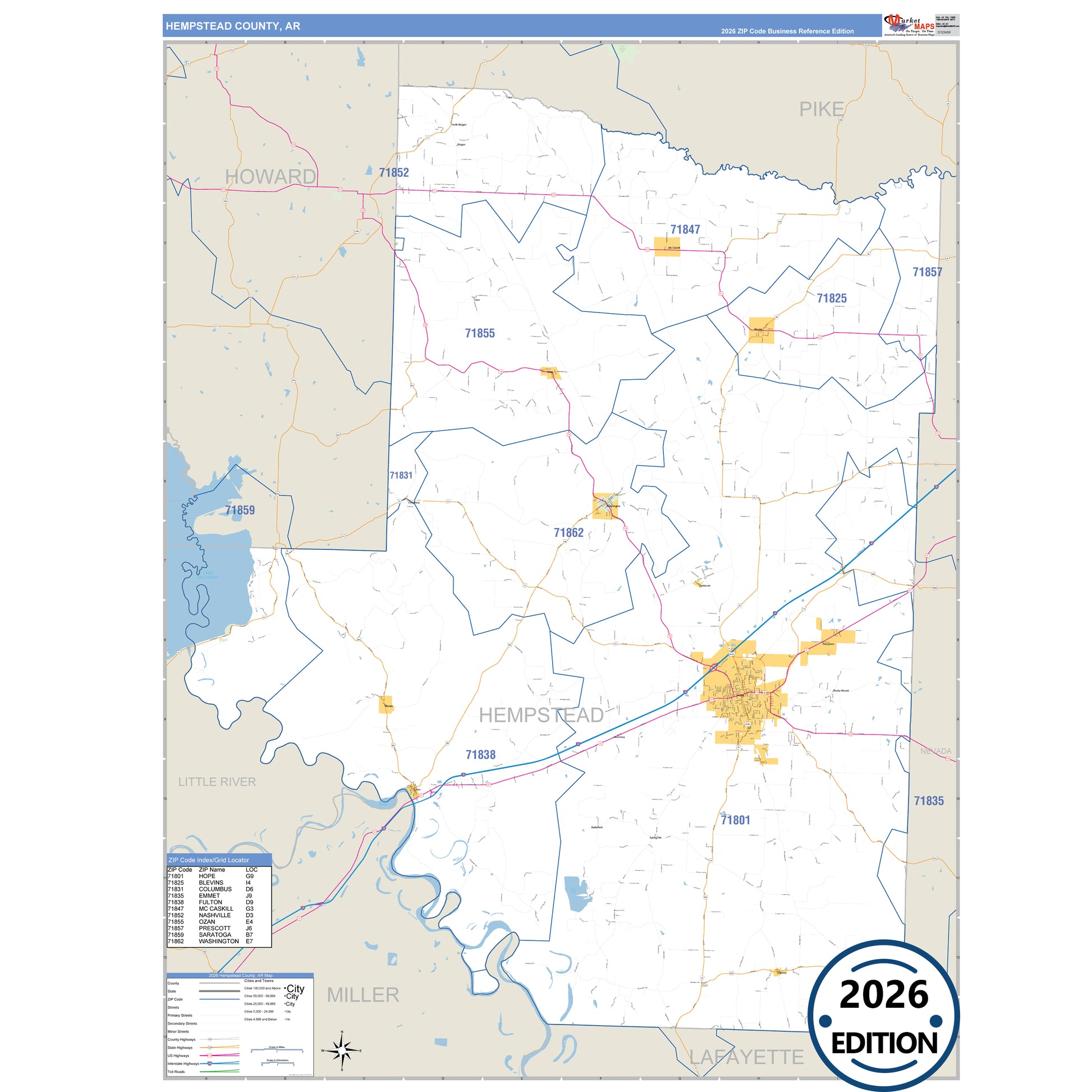 The Business Reference Style Hempstead County, AR is a detailed map that includes all towns, cities, major roadways, and highways. Available in multiple wall map sizes, perfect for home, school, office, or business display.