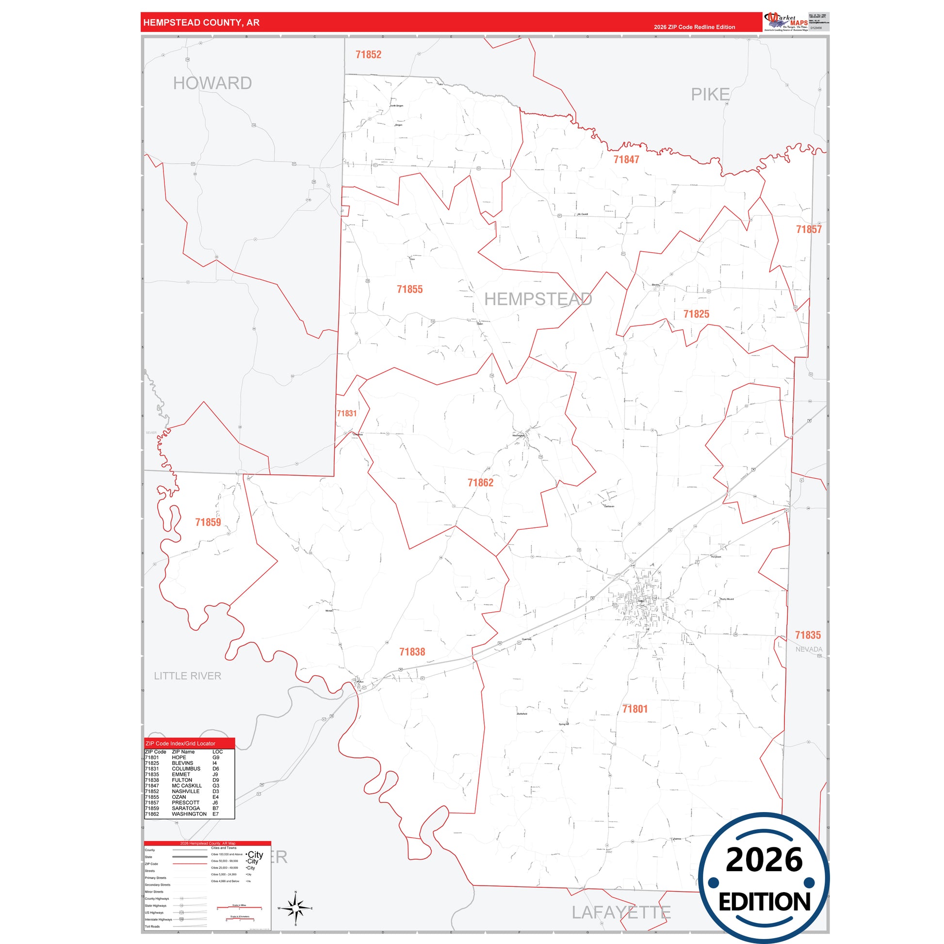 The RedLine Style map of Hempstead County, AR shows ZIP code areas overlaid on a detailed road network of Hempstead County, Arkansas. Ideal for drawing locations, territories, and other applications. Base map features include all major streets and highways labeled, cities and towns, county and state boundaries, neighborhood names, railroads, and a clean white background suitable for marking and planning.