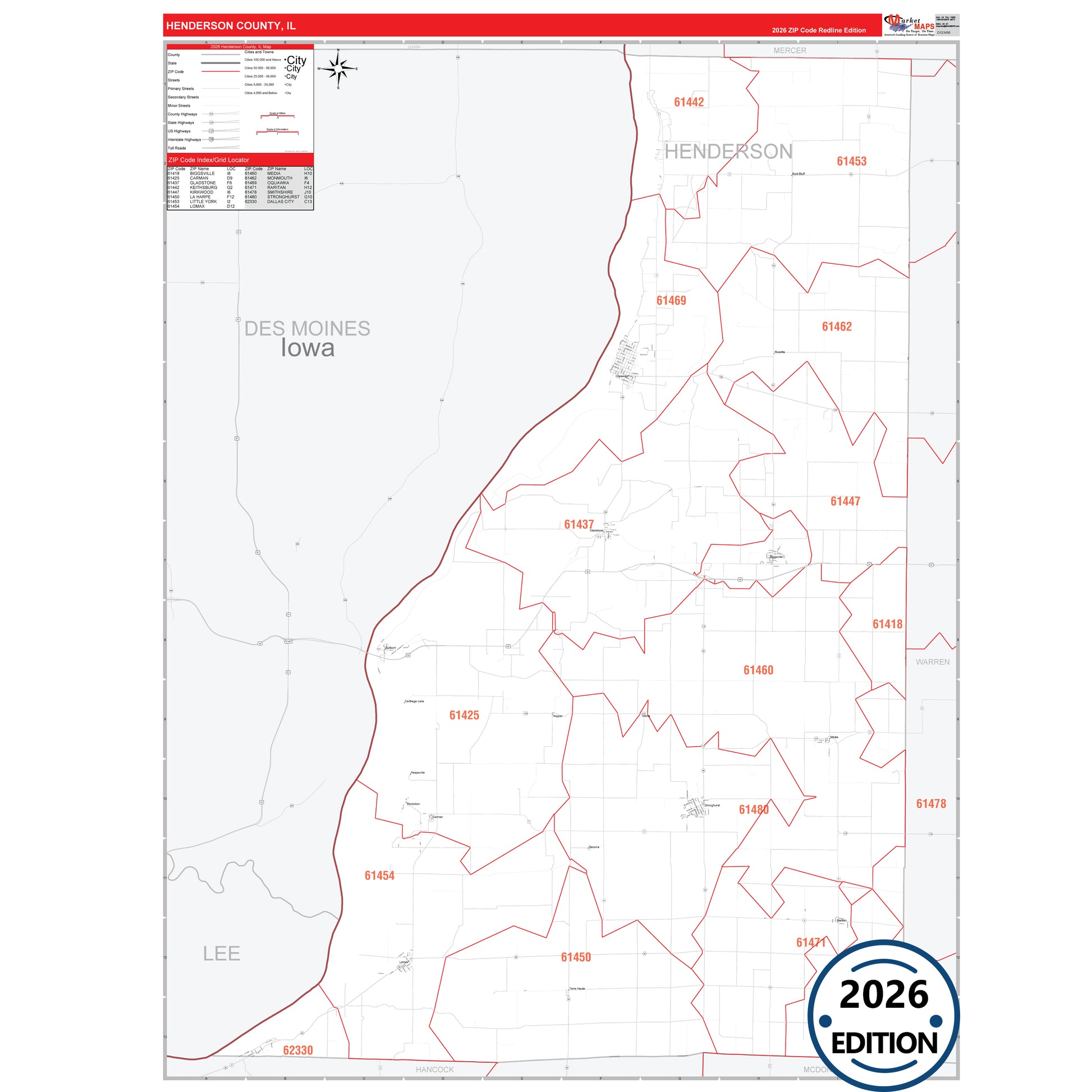 The RedLine Style map of Henderson County, IL shows ZIP code areas overlaid on a detailed road network of Henderson County, Illinois. Ideal for drawing locations, territories, and other applications. Base map features include all major streets and highways labeled, cities and towns, county and state boundaries, neighborhood names, railroads, and a clean white background suitable for marking and planning.