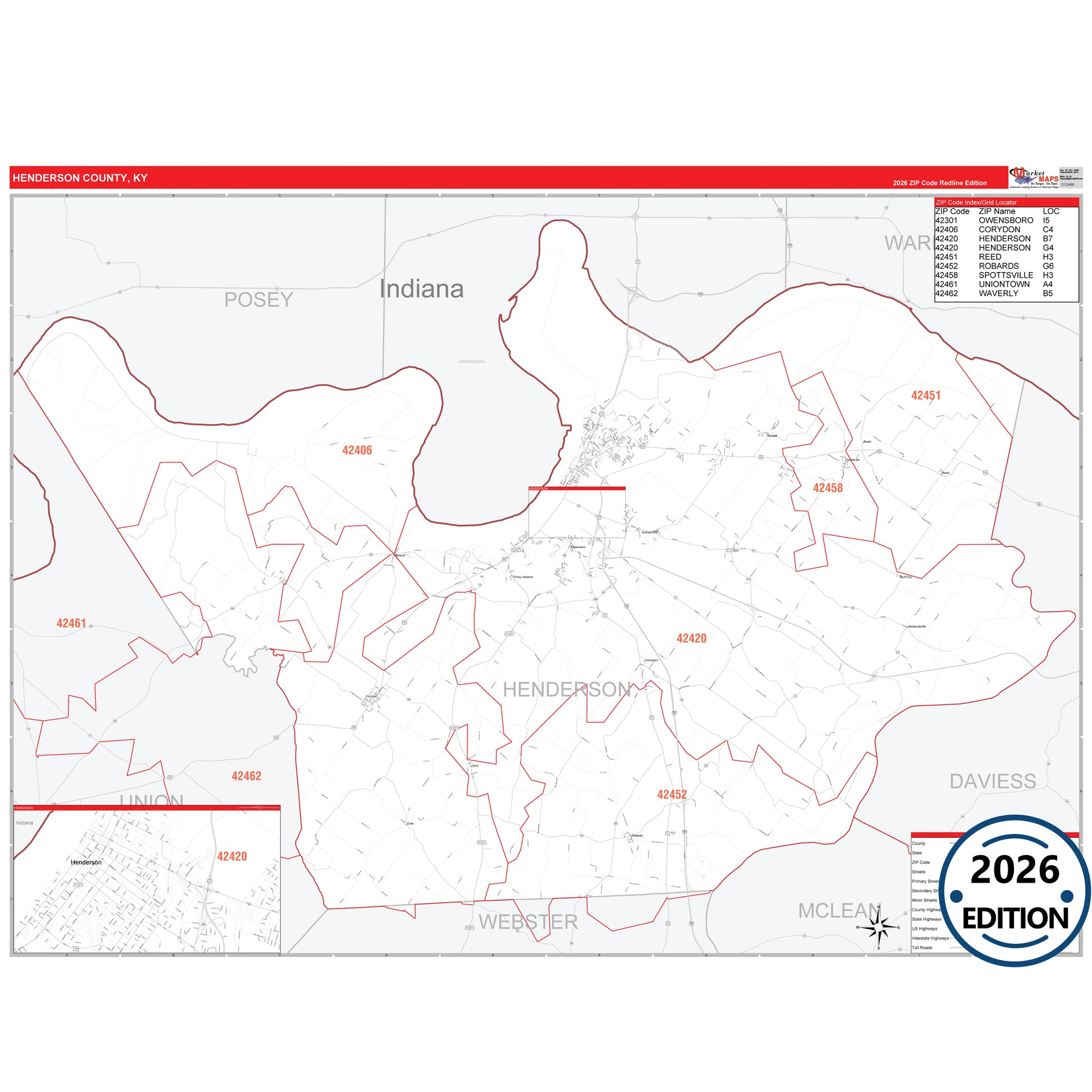 The RedLine Style map of Henderson County, KY shows ZIP code areas overlaid on a detailed road network of Henderson County, Kentucky. Ideal for drawing locations, territories, and other applications. Base map features include all major streets and highways labeled, cities and towns, county and state boundaries, neighborhood names, railroads, and a clean white background suitable for marking and planning.
