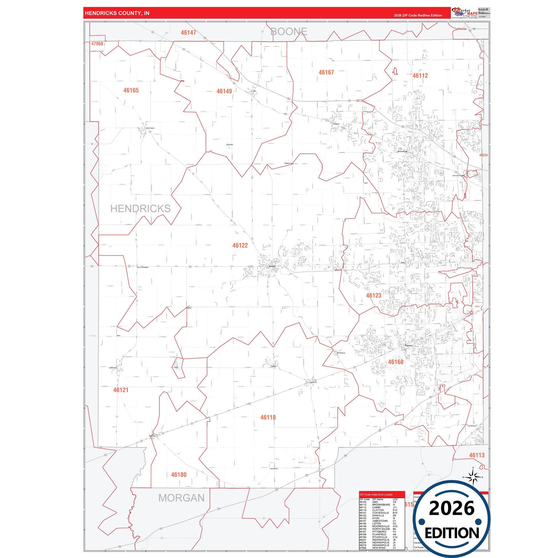 The RedLine Style map of Hendricks County, IN shows ZIP code areas overlaid on a detailed road network of Hendricks County, Indiana. Ideal for drawing locations, territories, and other applications. Base map features include all major streets and highways labeled, cities and towns, county and state boundaries, neighborhood names, railroads, and a clean white background suitable for marking and planning.