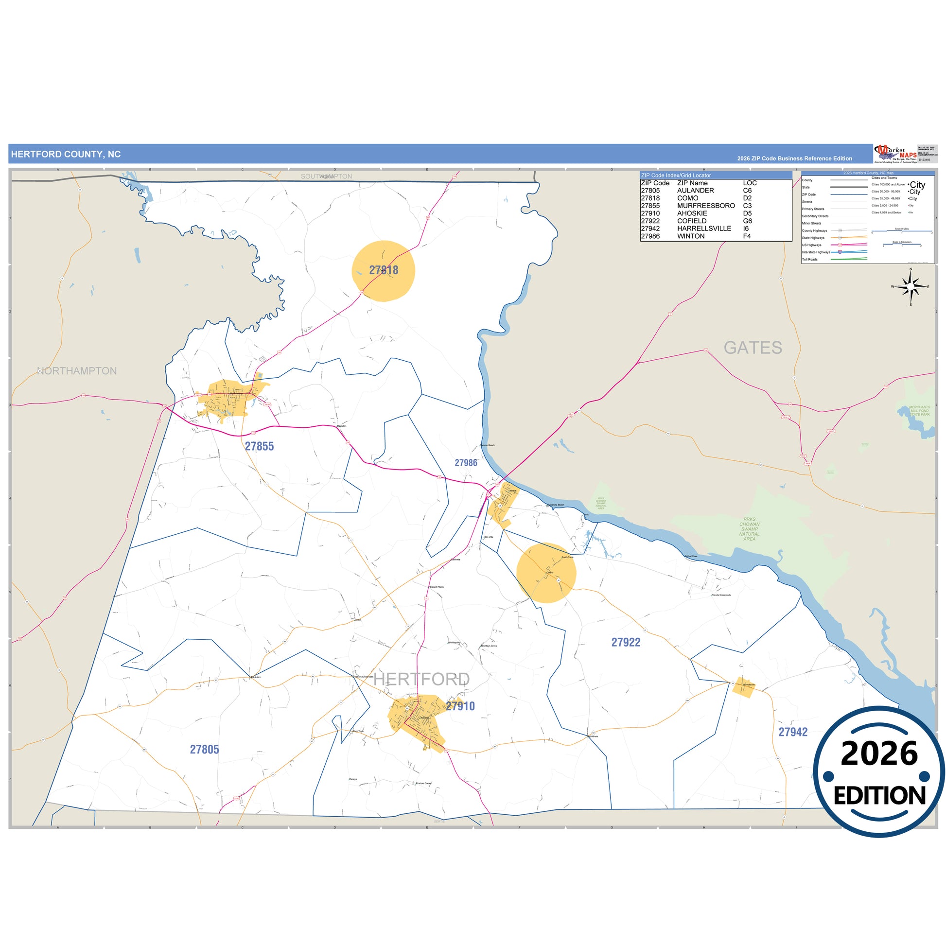 The Business Reference Style Hertford County, NC is a detailed map that includes all towns, cities, major roadways, and highways. Available in multiple wall map sizes, perfect for home, school, office, or business display.