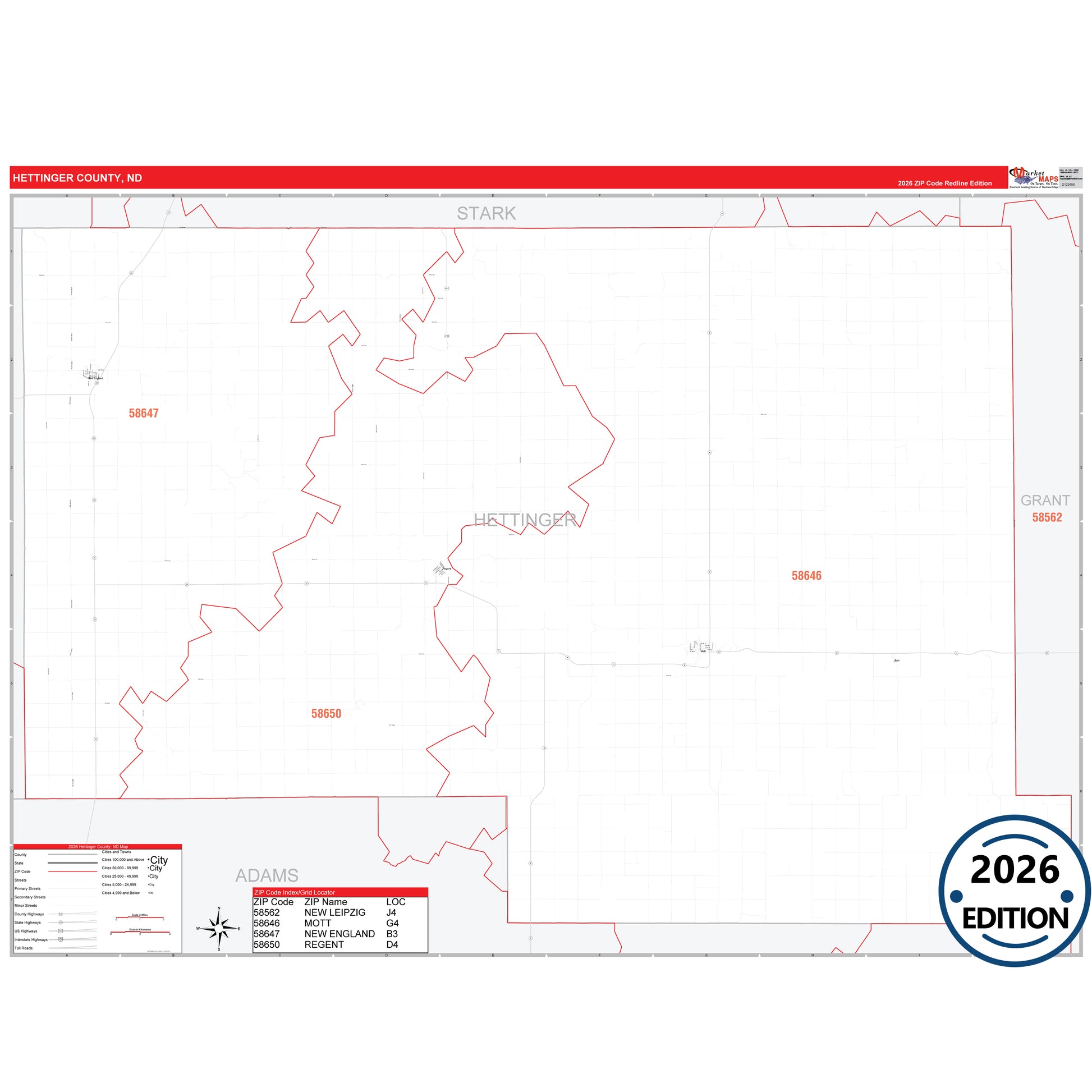The RedLine Style map of Hettinger County, ND shows ZIP code areas overlaid on a detailed road network of Hettinger County, North Dakota. Ideal for drawing locations, territories, and other applications. Base map features include all major streets and highways labeled, cities and towns, county and state boundaries, neighborhood names, railroads, and a clean white background suitable for marking and planning.