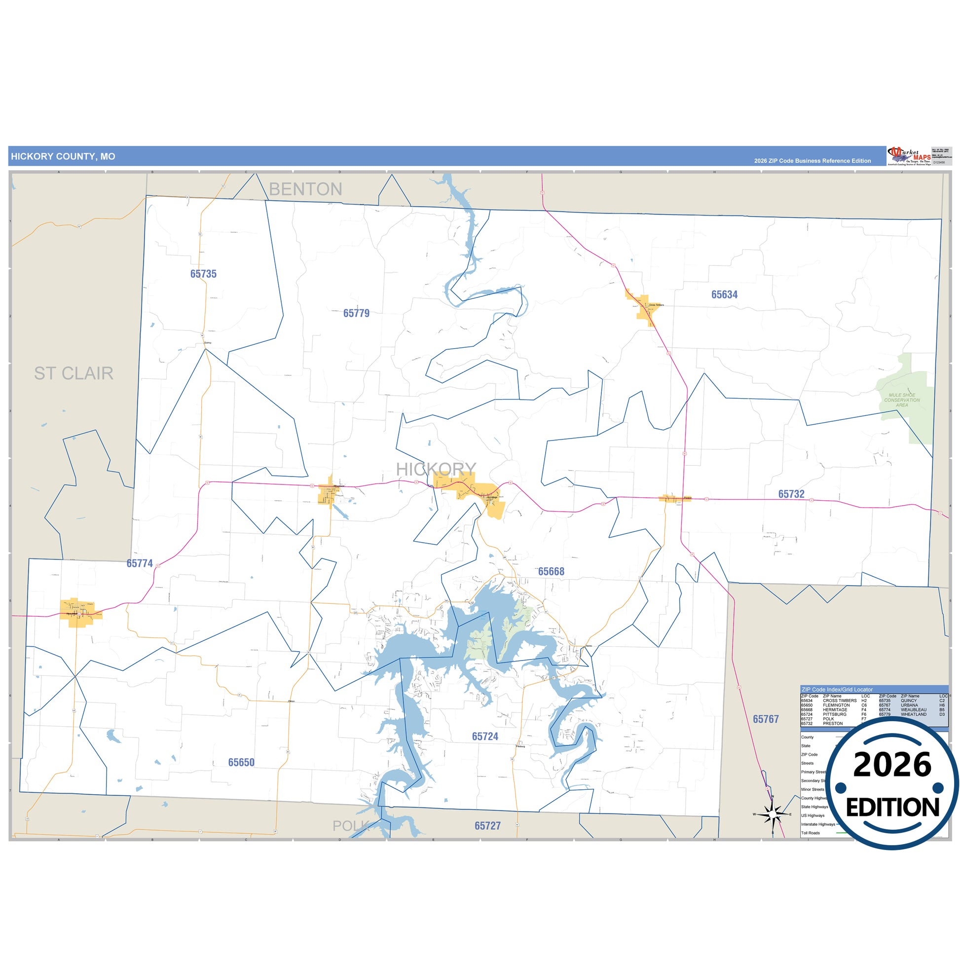 The Business Reference Style Hickory County, MO is a detailed map that includes all towns, cities, major roadways, and highways. Available in multiple wall map sizes, perfect for home, school, office, or business display.