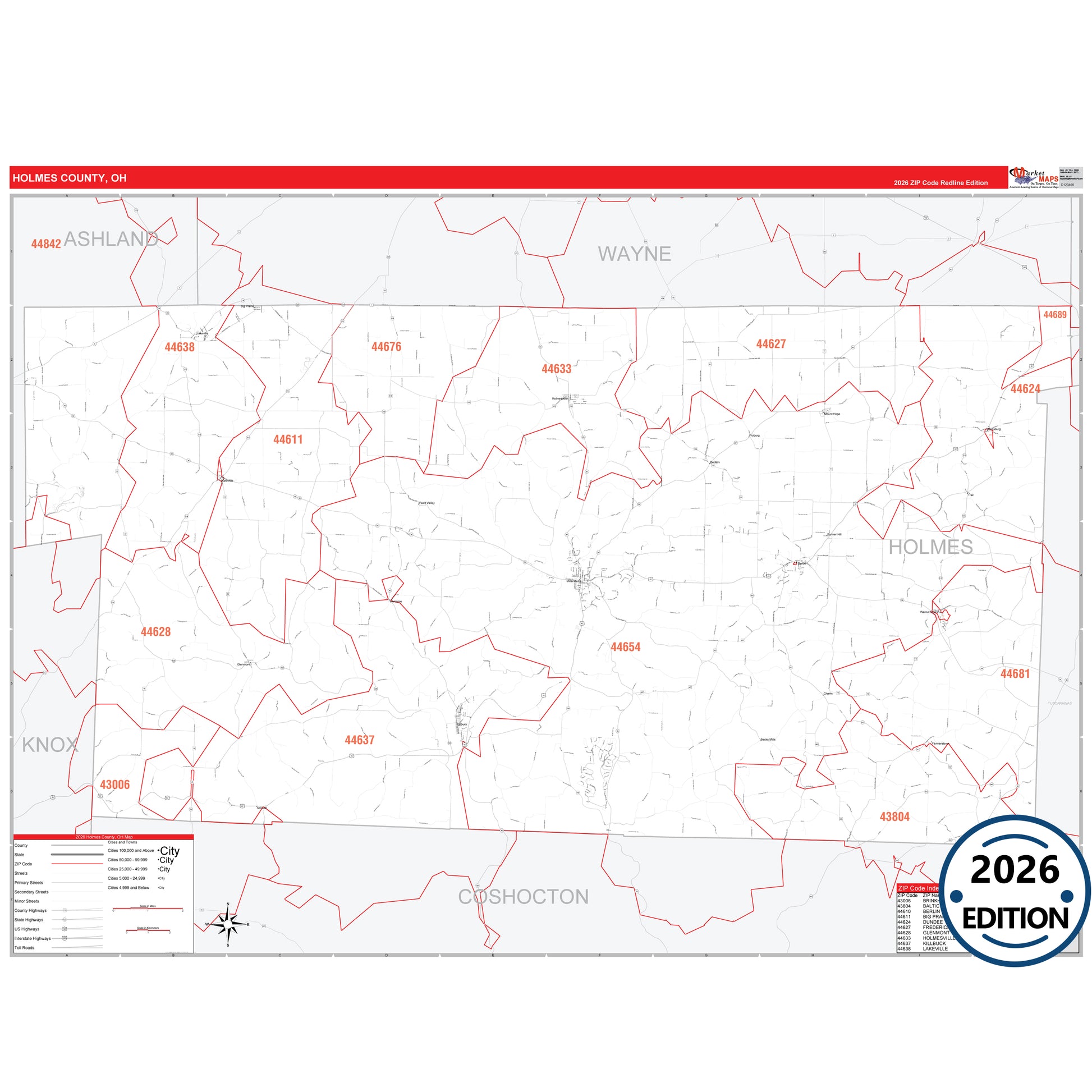 The RedLine Style map of Holmes County, OH shows ZIP code areas overlaid on a detailed road network of Holmes County, Ohio. Ideal for drawing locations, territories, and other applications. Base map features include all major streets and highways labeled, cities and towns, county and state boundaries, neighborhood names, railroads, and a clean white background suitable for marking and planning.