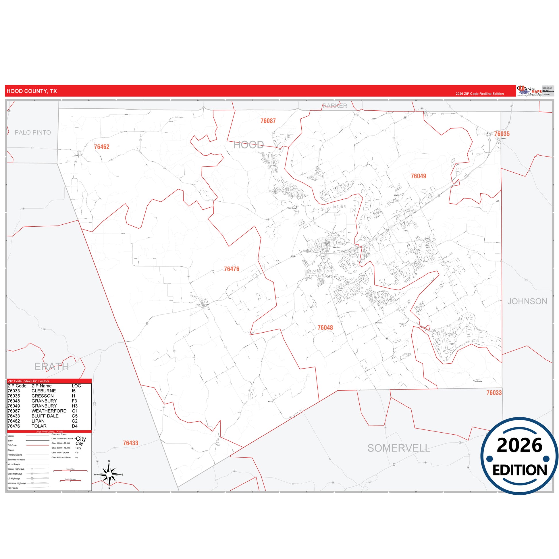 The RedLine Style map of Hood County, TX shows ZIP code areas overlaid on a detailed road network of Hood County, Texas. Ideal for drawing locations, territories, and other applications. Base map features include all major streets and highways labeled, cities and towns, county and state boundaries, neighborhood names, railroads, and a clean white background suitable for marking and planning.