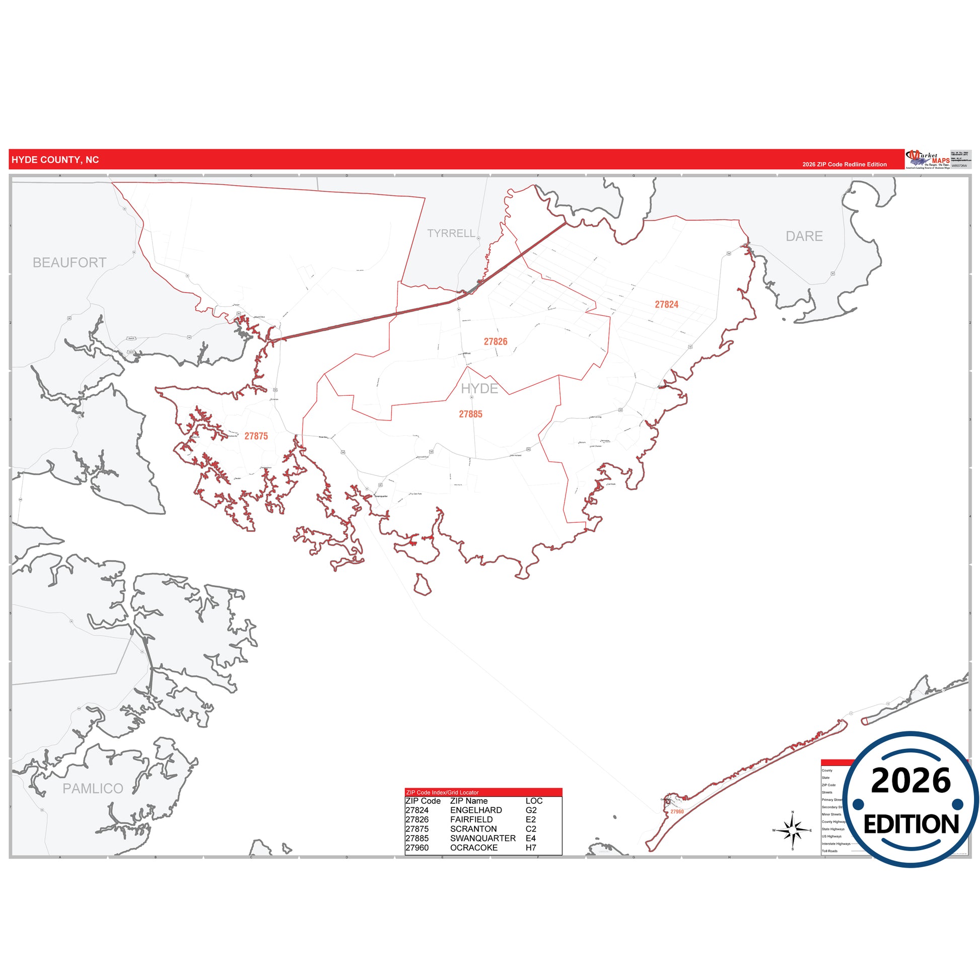 The RedLine Style map of Hyde County, NC shows ZIP code areas overlaid on a detailed road network of Hyde County, North Carolina. Ideal for drawing locations, territories, and other applications. Base map features include all major streets and highways labeled, cities and towns, county and state boundaries, neighborhood names, railroads, and a clean white background suitable for marking and planning.