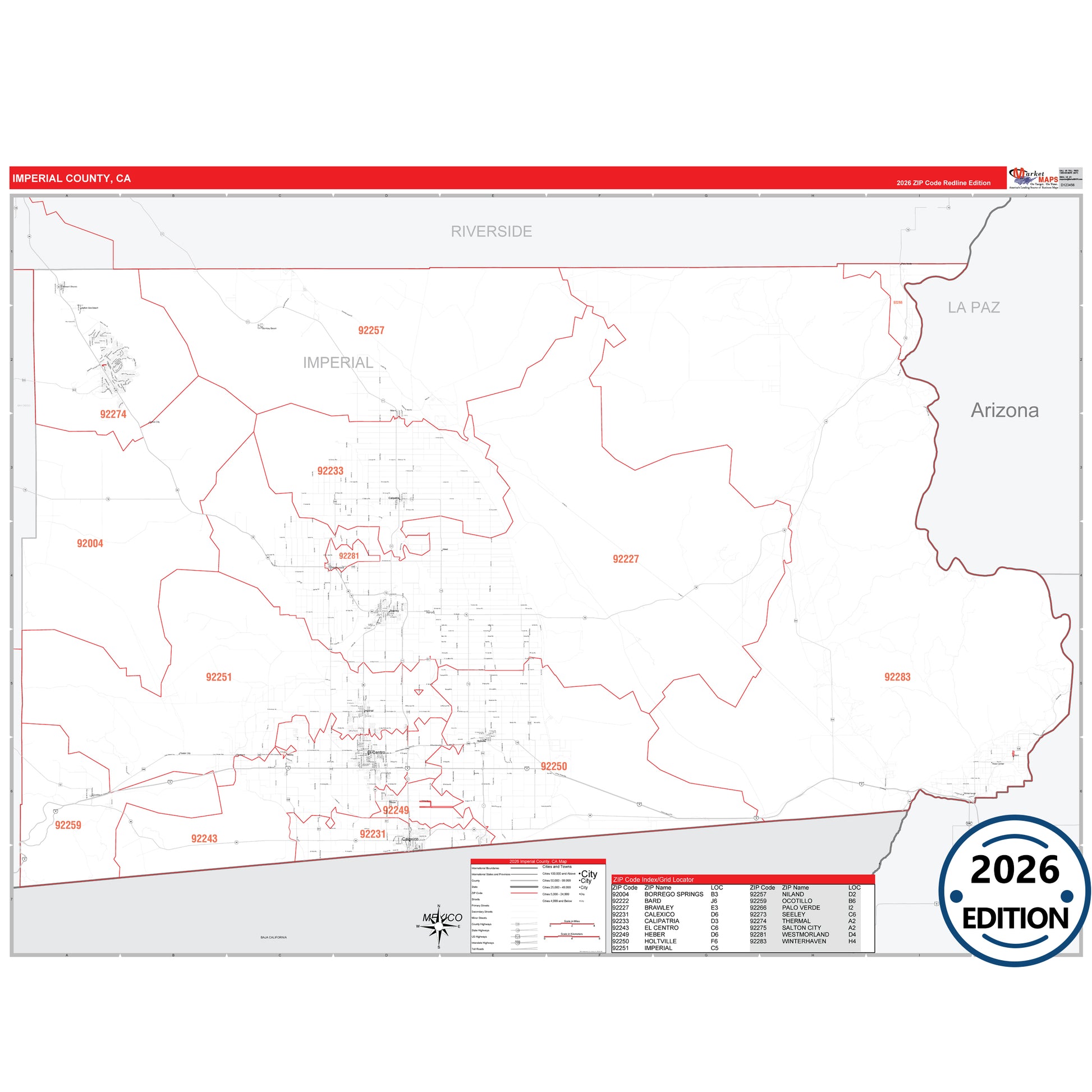 The RedLine Style map of Imperial County, CA shows ZIP code areas overlaid on a detailed road network of Imperial County, California. Ideal for drawing locations, territories, and other applications. Base map features include all major streets and highways labeled, cities and towns, county and state boundaries, neighborhood names, railroads, and a clean white background suitable for marking and planning.