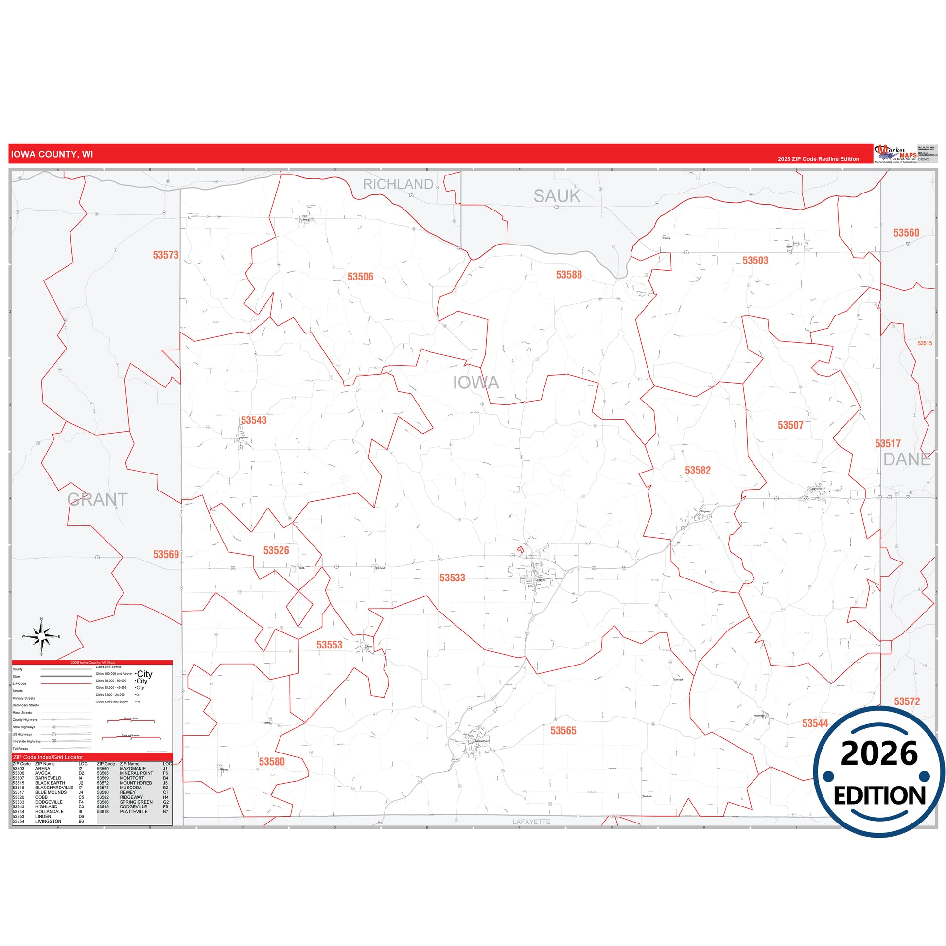 The RedLine Style map of Iowa County, WI shows ZIP code areas overlaid on a detailed road network of Iowa County, Wisconsin. Ideal for drawing locations, territories, and other applications. Base map features include all major streets and highways labeled, cities and towns, county and state boundaries, neighborhood names, railroads, and a clean white background suitable for marking and planning.