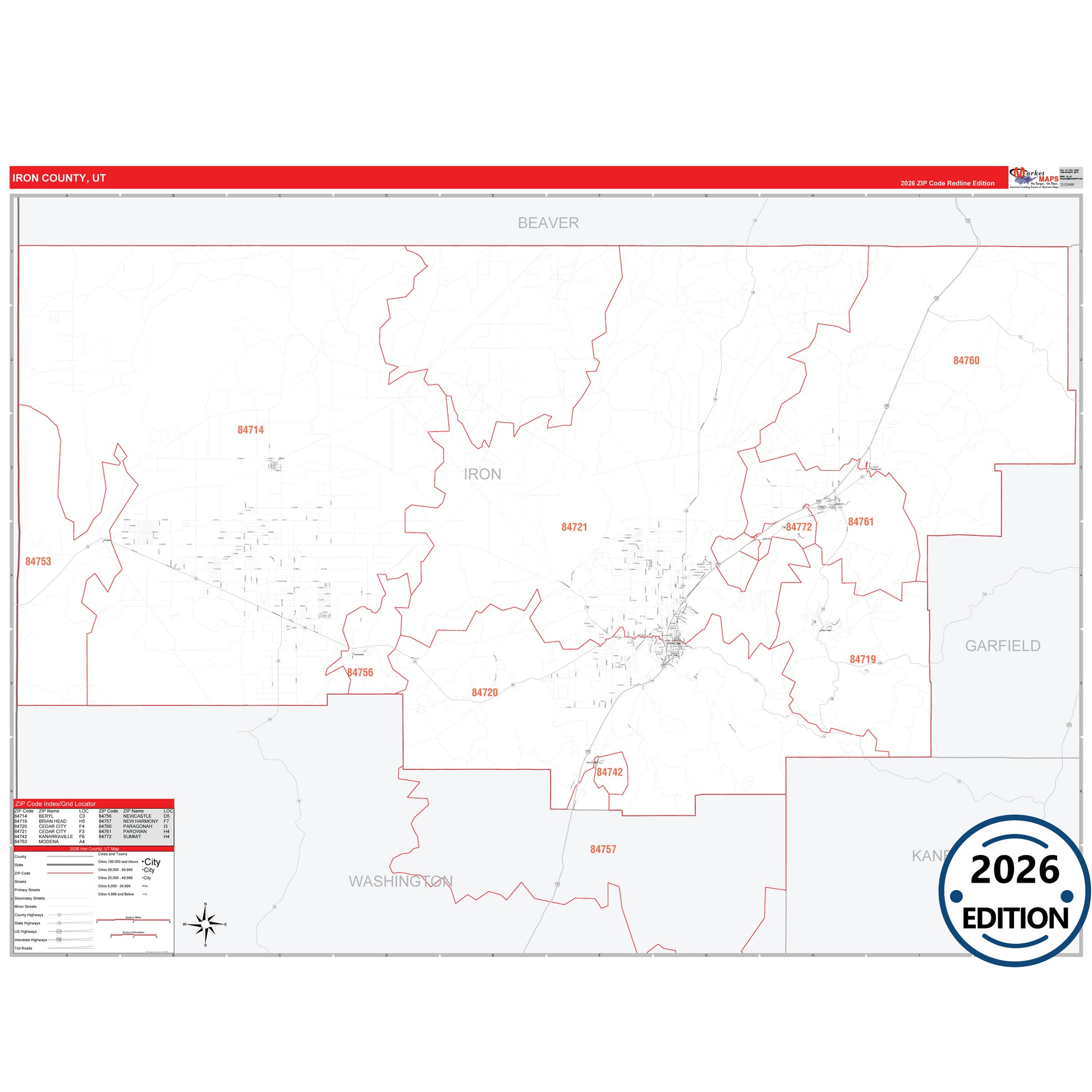 The RedLine Style map of Iron County, UT shows ZIP code areas overlaid on a detailed road network of Iron County, Utah. Ideal for drawing locations, territories, and other applications. Base map features include all major streets and highways labeled, cities and towns, county and state boundaries, neighborhood names, railroads, and a clean white background suitable for marking and planning.