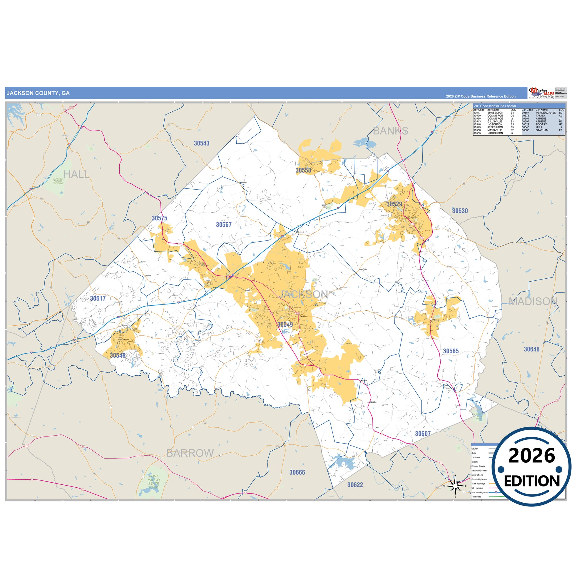 The Business Reference Style Jackson County, GA is a detailed map that includes all towns, cities, major roadways, and highways. Available in multiple wall map sizes, perfect for home, school, office, or business display.