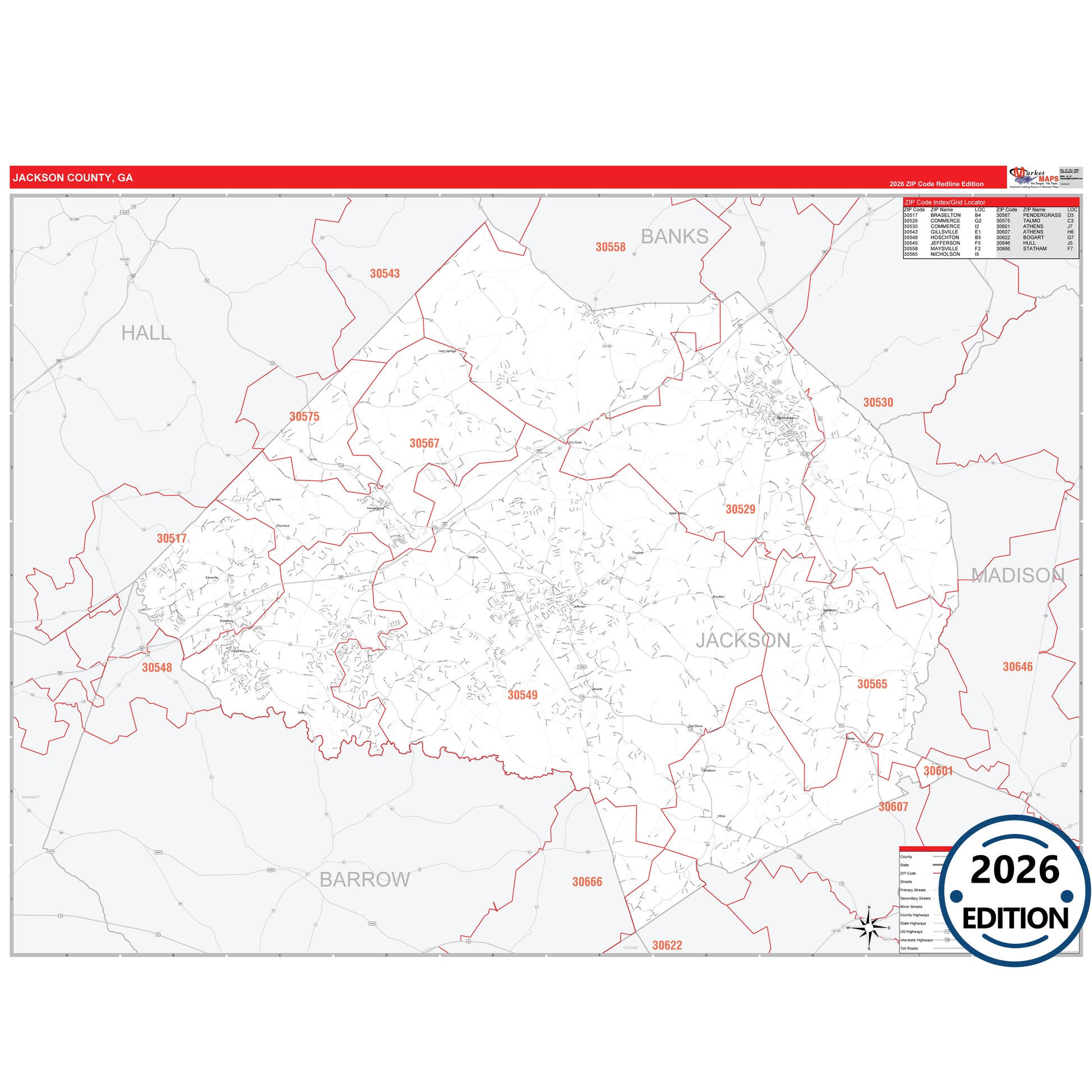 The RedLine Style map of Jackson County, GA shows ZIP code areas overlaid on a detailed road network of Jackson County, Georgia. Ideal for drawing locations, territories, and other applications. Base map features include all major streets and highways labeled, cities and towns, county and state boundaries, neighborhood names, railroads, and a clean white background suitable for marking and planning.