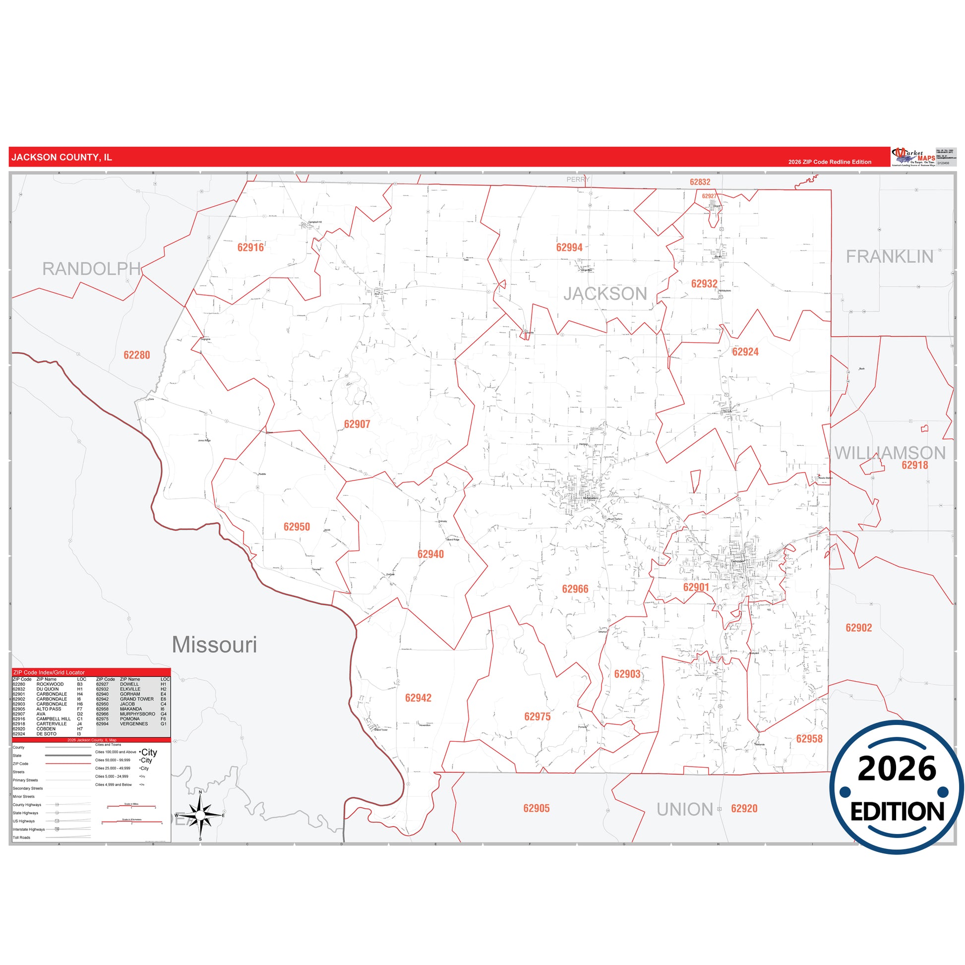 The RedLine Style map of Jackson County, IL shows ZIP code areas overlaid on a detailed road network of Jackson County, Illinois. Ideal for drawing locations, territories, and other applications. Base map features include all major streets and highways labeled, cities and towns, county and state boundaries, neighborhood names, railroads, and a clean white background suitable for marking and planning.
