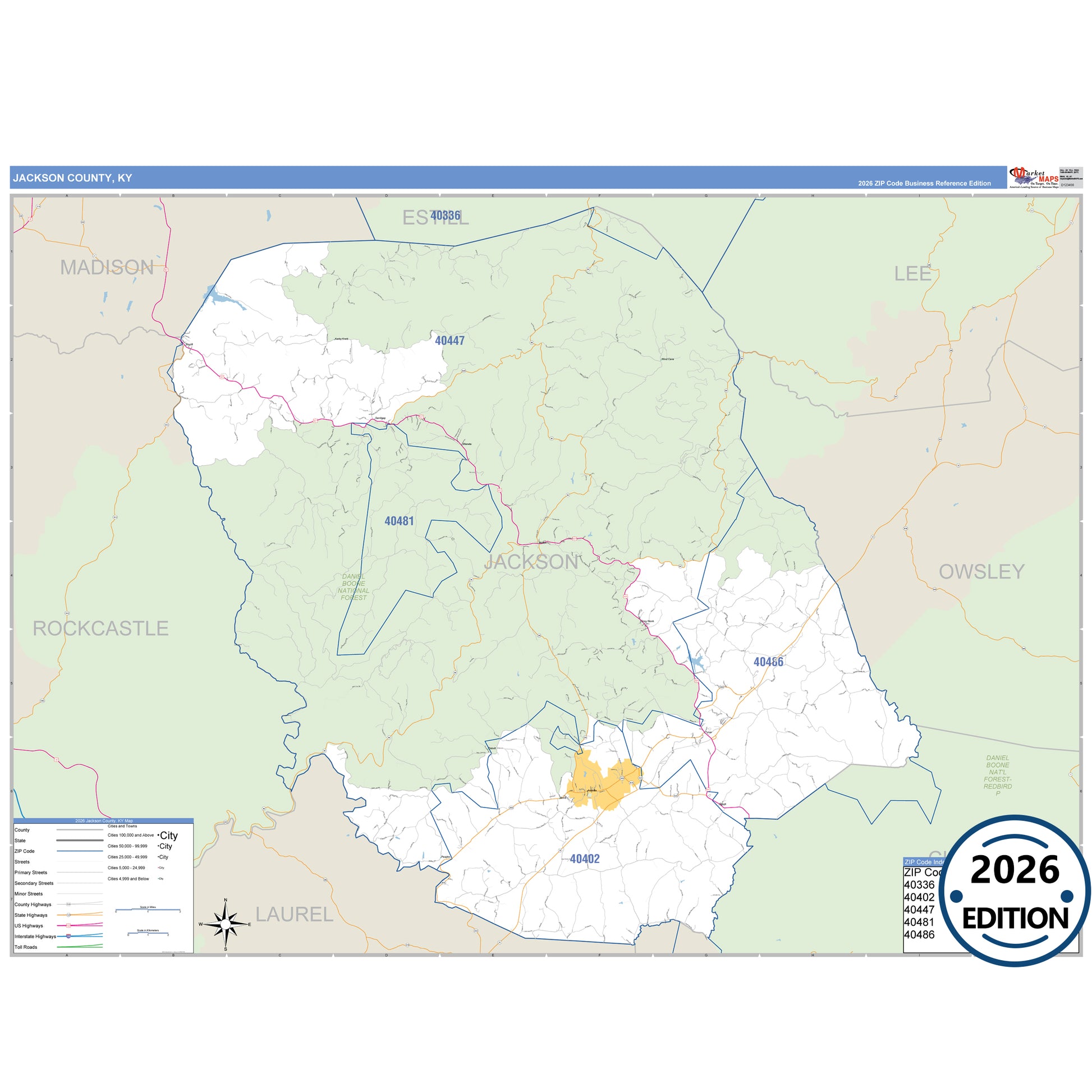 The Business Reference Style Jackson County, KY is a detailed map that includes all towns, cities, major roadways, and highways. Available in multiple wall map sizes, perfect for home, school, office, or business display.