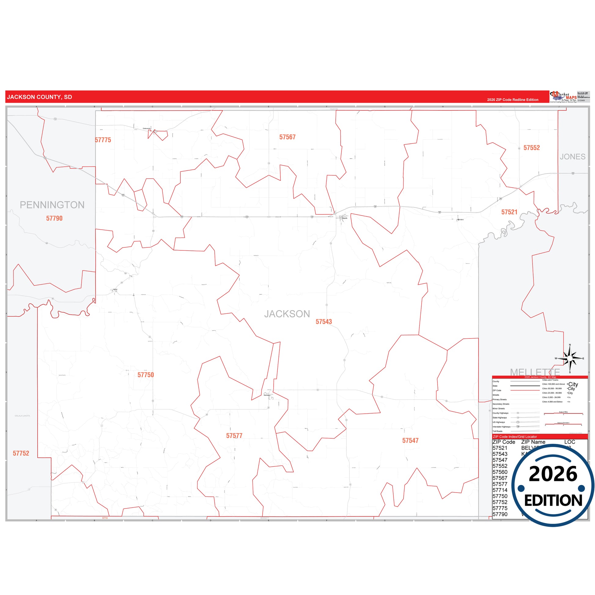 The RedLine Style map of Jackson County, SD shows ZIP code areas overlaid on a detailed road network of Jackson County, South Dakota. Ideal for drawing locations, territories, and other applications. Base map features include all major streets and highways labeled, cities and towns, county and state boundaries, neighborhood names, railroads, and a clean white background suitable for marking and planning.
