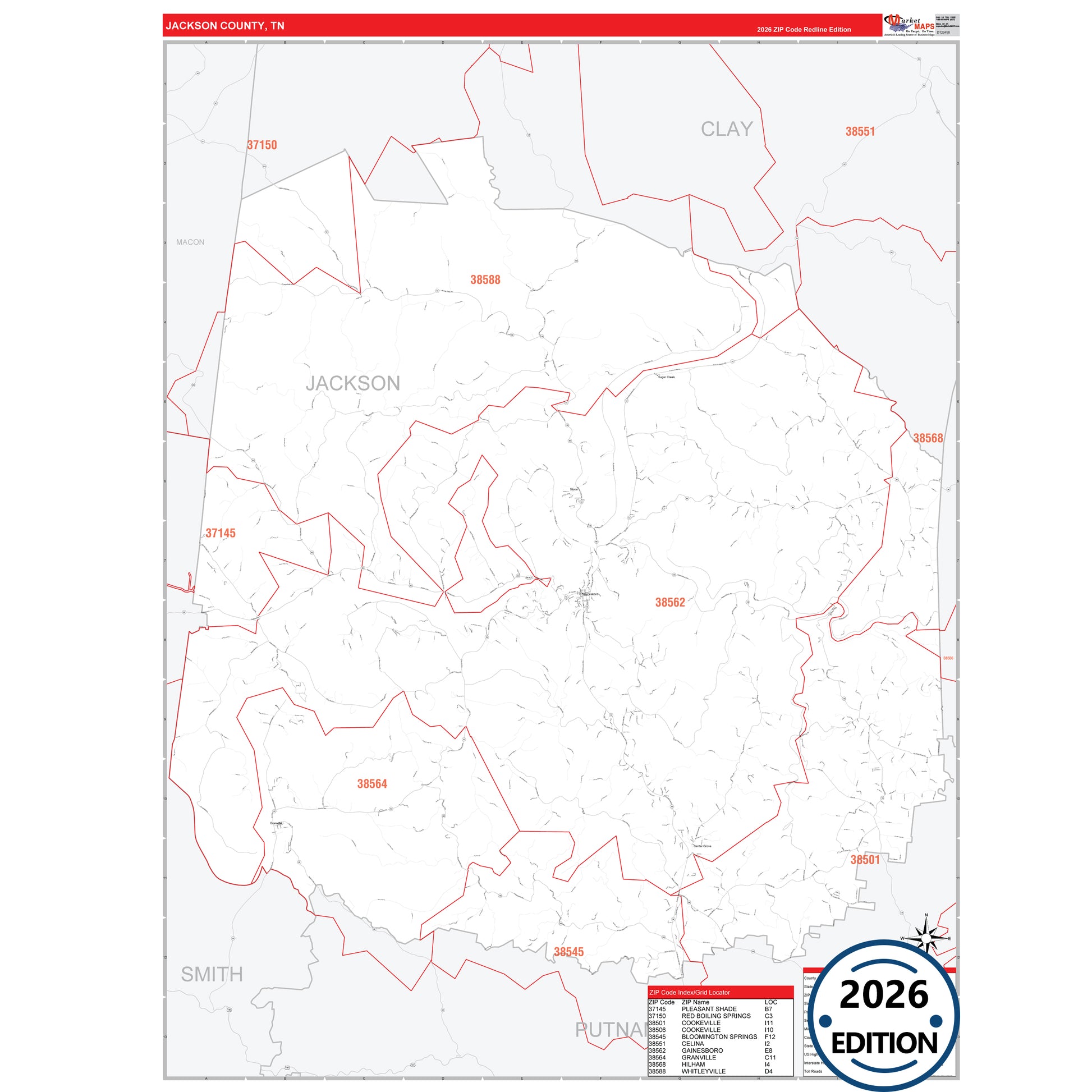 The RedLine Style map of Jackson County, TN shows ZIP code areas overlaid on a detailed road network of Jackson County, Tennessee. Ideal for drawing locations, territories, and other applications. Base map features include all major streets and highways labeled, cities and towns, county and state boundaries, neighborhood names, railroads, and a clean white background suitable for marking and planning.
