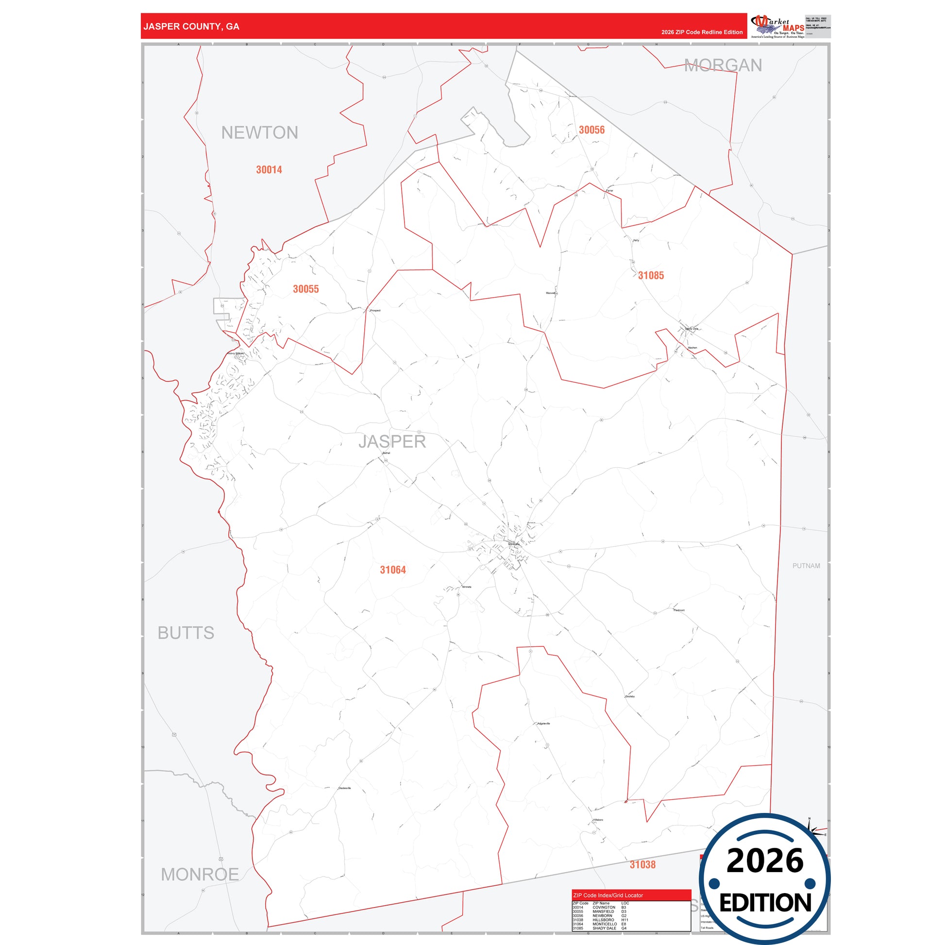 The RedLine Style map of Jasper County, GA shows ZIP code areas overlaid on a detailed road network of Jasper County, Georgia. Ideal for drawing locations, territories, and other applications. Base map features include all major streets and highways labeled, cities and towns, county and state boundaries, neighborhood names, railroads, and a clean white background suitable for marking and planning.