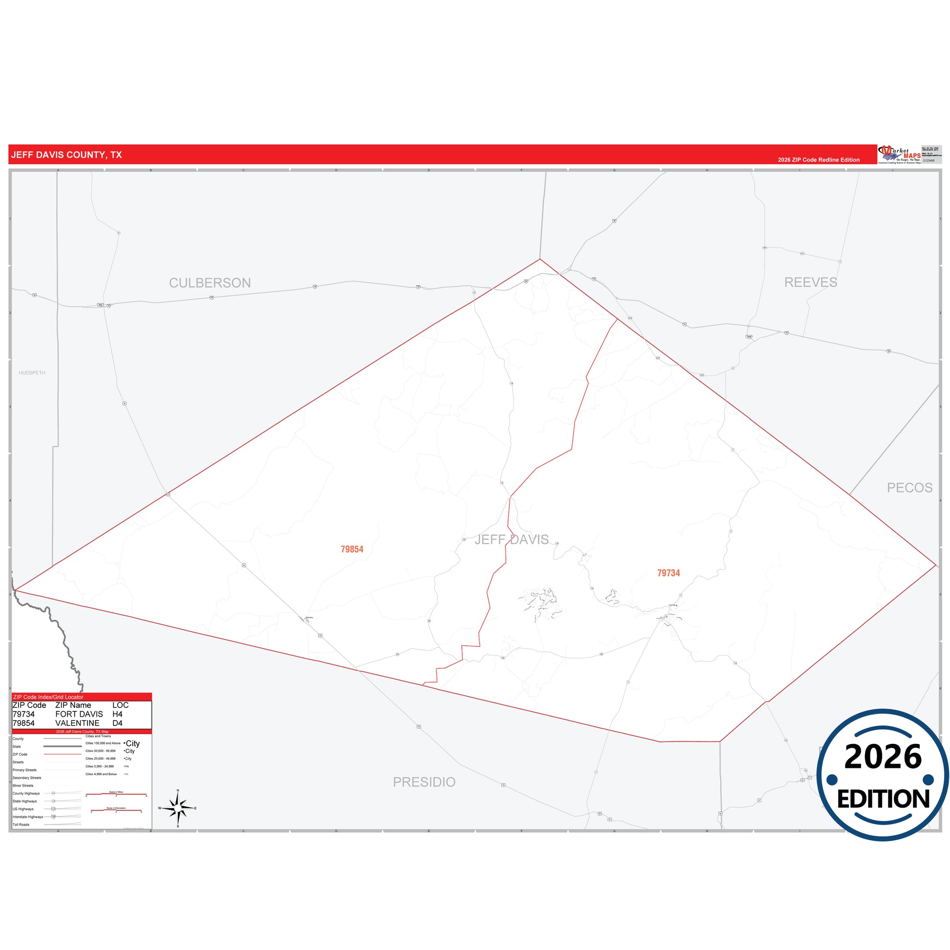 The RedLine Style map of Jeff Davis County, TX shows ZIP code areas overlaid on a detailed road network of Jeff Davis County, Texas. Ideal for drawing locations, territories, and other applications. Base map features include all major streets and highways labeled, cities and towns, county and state boundaries, neighborhood names, railroads, and a clean white background suitable for marking and planning.
