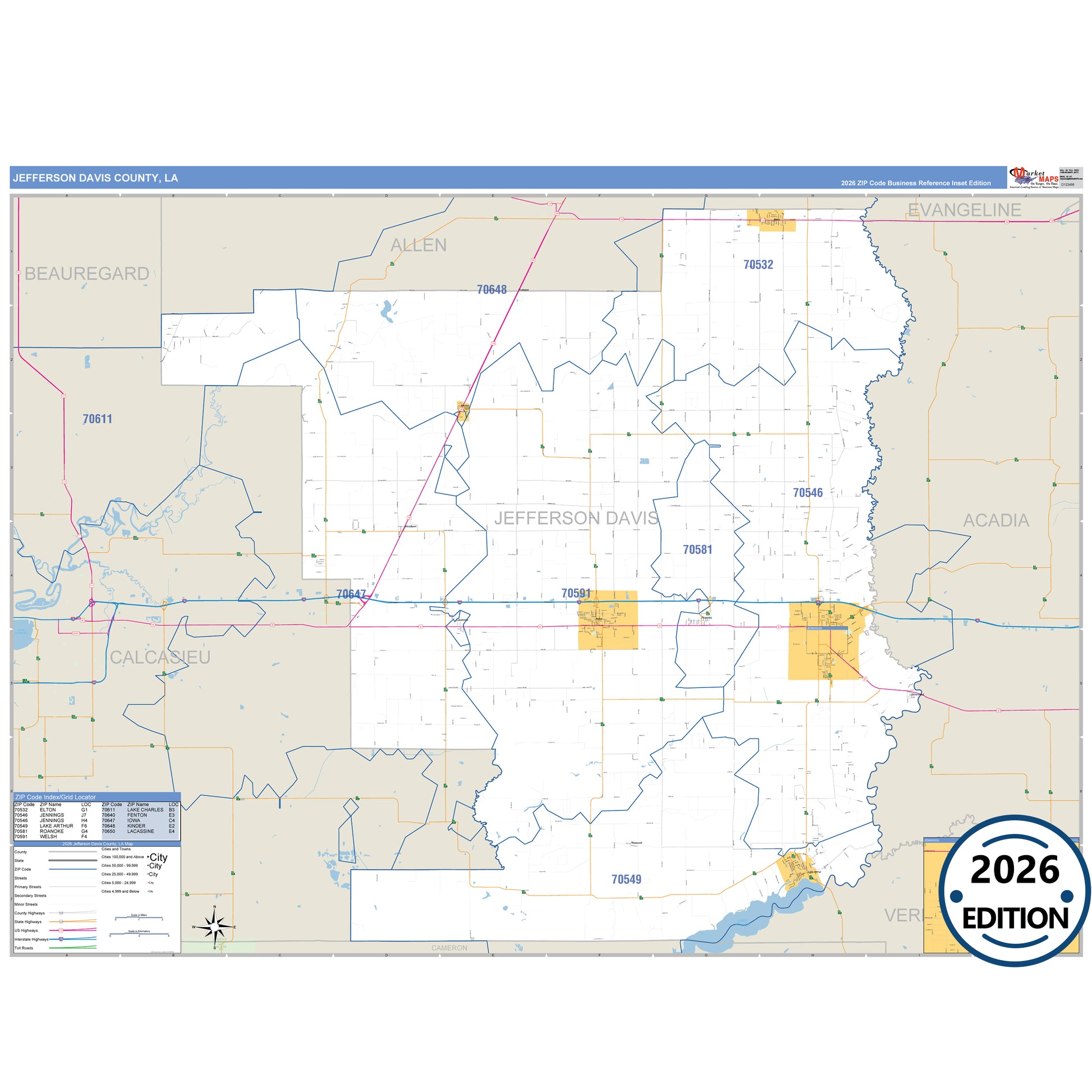 The Business Reference Style Jefferson Davis County, LA is a detailed map that includes all towns, cities, major roadways, and highways. Available in multiple wall map sizes, perfect for home, school, office, or business display.