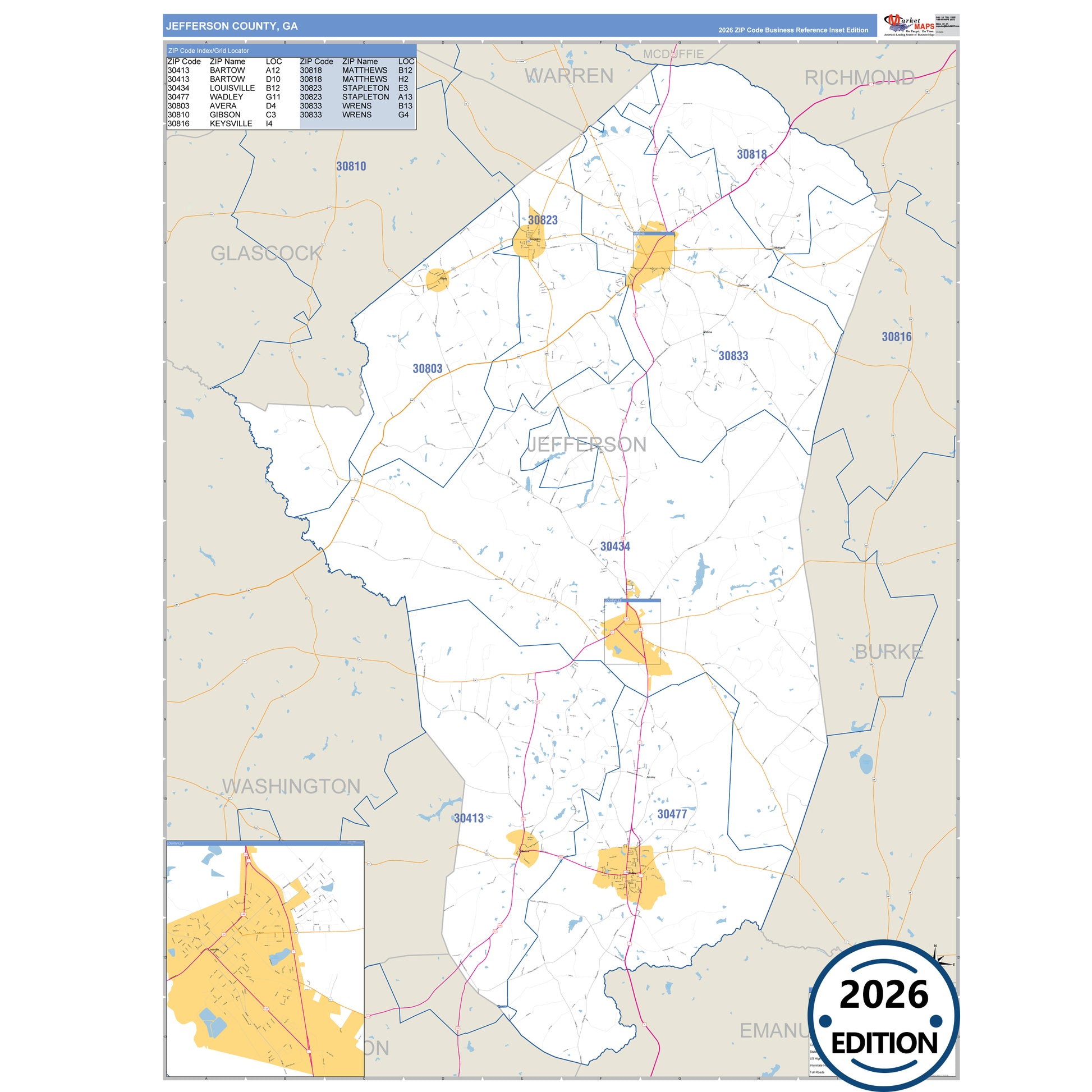 The Business Reference Style Jefferson County, GA is a detailed map that includes all towns, cities, major roadways, and highways. Available in multiple wall map sizes, perfect for home, school, office, or business display.