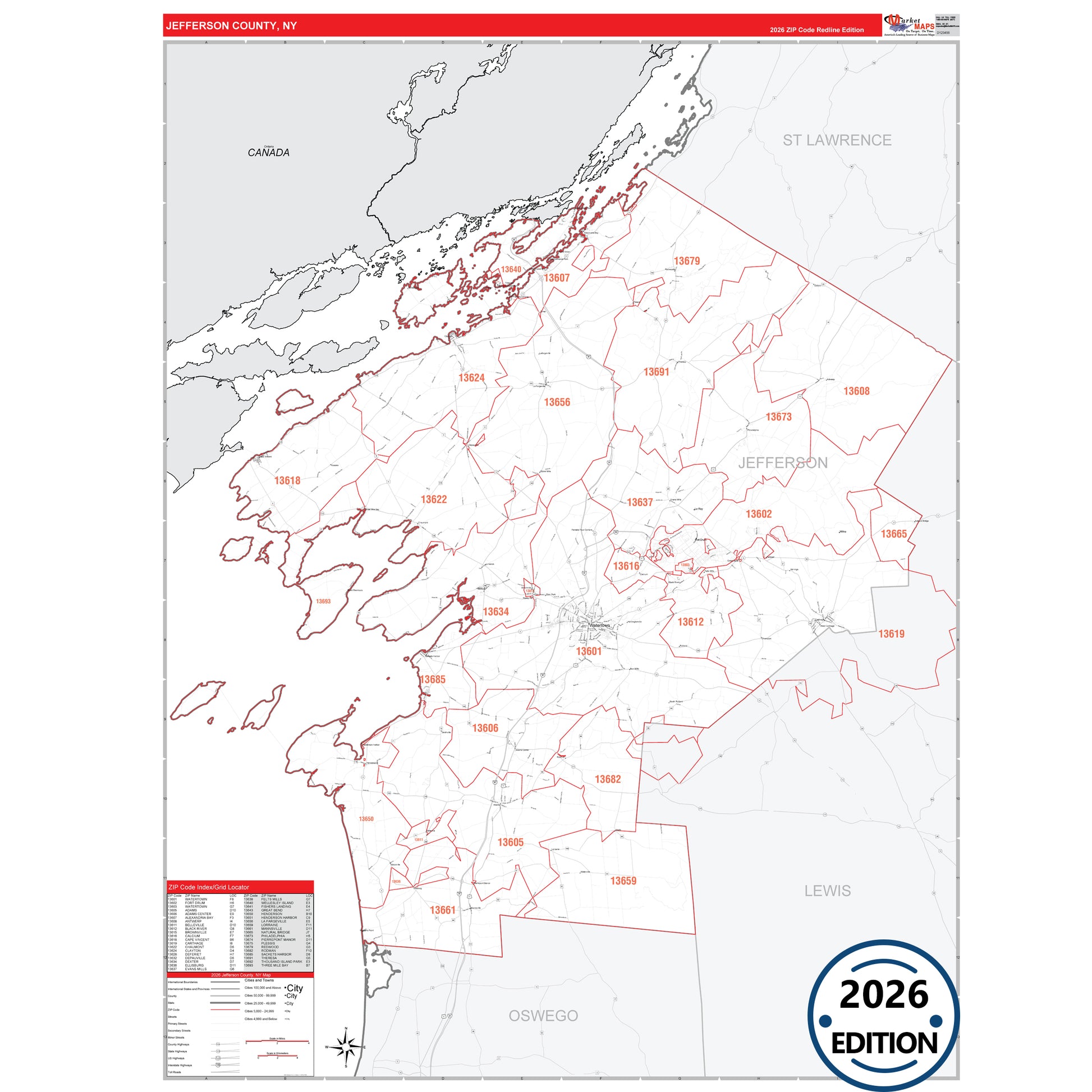The RedLine Style map of Jefferson County, NY shows ZIP code areas overlaid on a detailed road network of Jefferson County, New York. Ideal for drawing locations, territories, and other applications. Base map features include all major streets and highways labeled, cities and towns, county and state boundaries, neighborhood names, railroads, and a clean white background suitable for marking and planning.