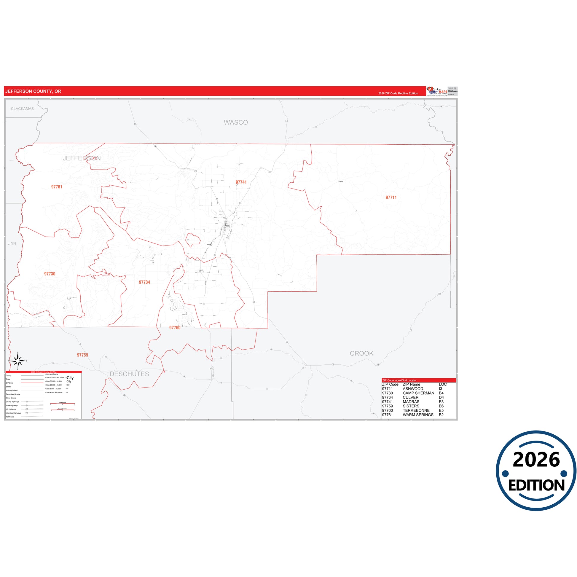 The RedLine Style map of Jefferson County, OR shows ZIP code areas overlaid on a detailed road network of Jefferson County, Oregon. Ideal for drawing locations, territories, and other applications. Base map features include all major streets and highways labeled, cities and towns, county and state boundaries, neighborhood names, railroads, and a clean white background suitable for marking and planning.