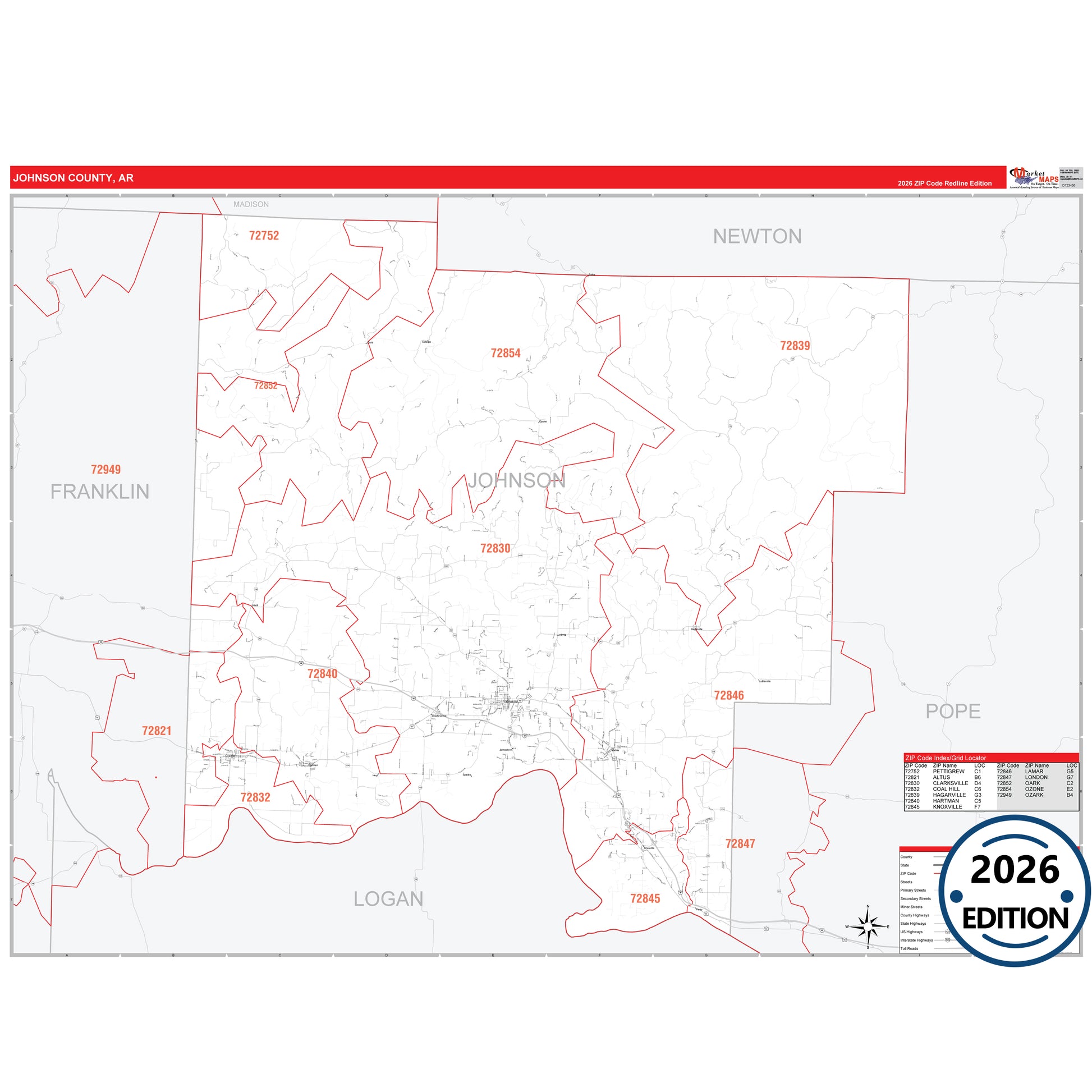 The RedLine Style map of Johnson County, AR shows ZIP code areas overlaid on a detailed road network of Johnson County, Arkansas. Ideal for drawing locations, territories, and other applications. Base map features include all major streets and highways labeled, cities and towns, county and state boundaries, neighborhood names, railroads, and a clean white background suitable for marking and planning.
