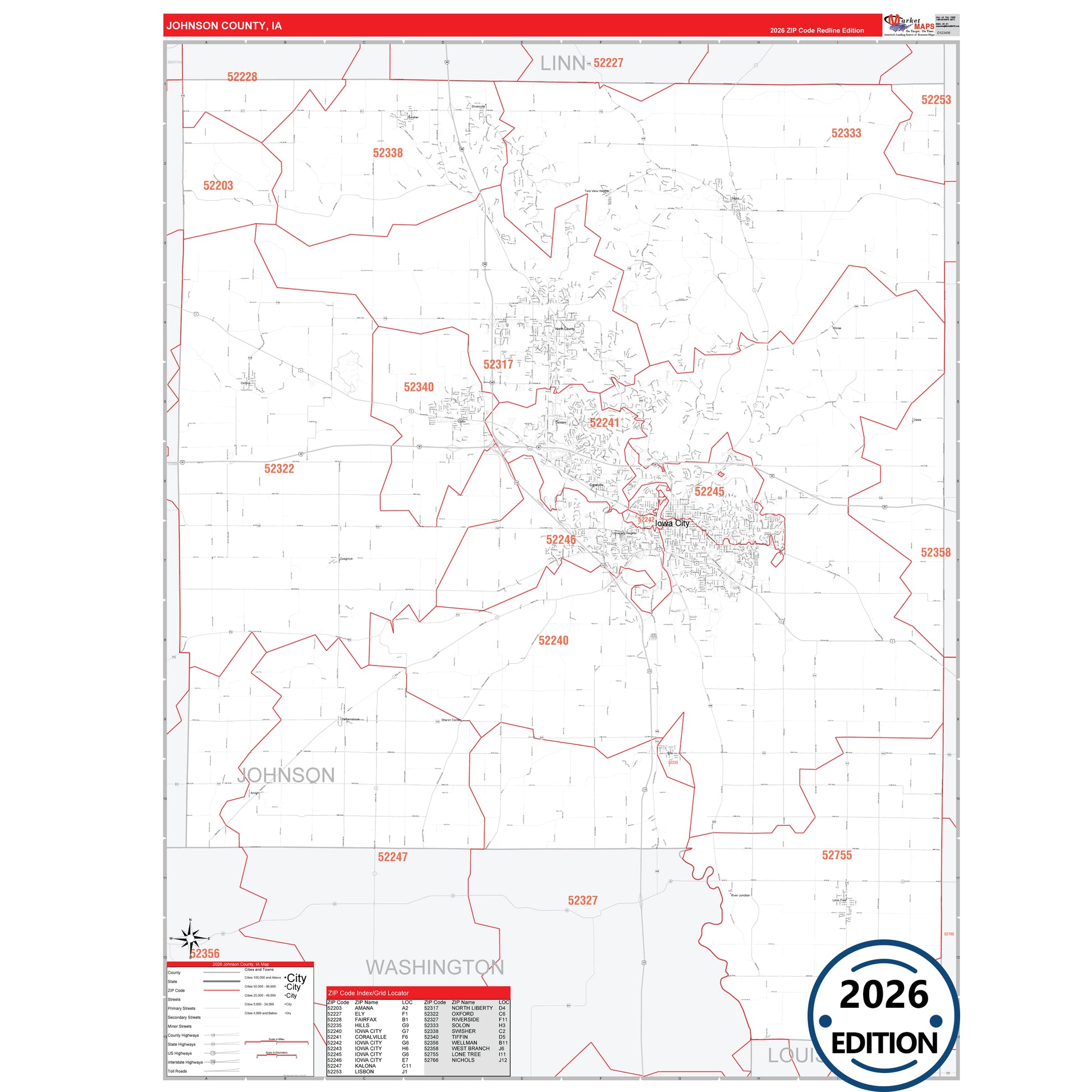 The RedLine Style map of Johnson County, IA shows ZIP code areas overlaid on a detailed road network of Johnson County, Iowa. Ideal for drawing locations, territories, and other applications. Base map features include all major streets and highways labeled, cities and towns, county and state boundaries, neighborhood names, railroads, and a clean white background suitable for marking and planning.